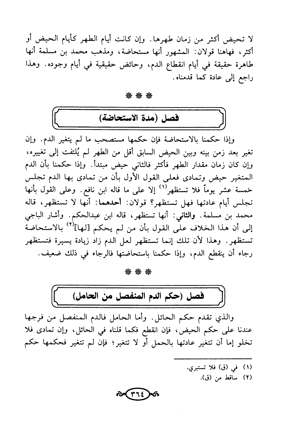 وإذا حكمنا بالاستحاضة فإن حكمها مستصحب ما لم يتغير الدم. وإن تغير بعد زمن بينه وبين الحيض السابق أقل من الطهر لم يُلتفت إلى تغييره، وإن كان زمان مقدار الطهر فأكثر فالثاني حيض مبتدأ. وإذا حكمنا بأن الدم المتغير حيض وتمادى فعلى القول الأول بأن من تمادى بها الدم تجلس خمسة عشر يوماً فلا تستظهر (¬1) إلا على ما قاله ابن نافع. وعلى القول بأنها تجلس أيام عادتها فهل تستظهر؟ قولان: أحدهما: أنها لا تستظهر، قاله محمد بن مسلمة. والثاني: أنها تستظهر، قاله ابن عبد الحكم. وأشار الباجي إلى أن هذا الخلاف على القول بأن من لم يحكم [لها] (¬2) بالاستحاضة تستظهر. وهذا لأن تلك إنما تستظهر لعل الدم زاد زيادة يسيرة فتستظهر رجاء أن ينقطع الدم، وإذا حكمنا باستحاضتها فالرجاء في ذلك ضعيف.