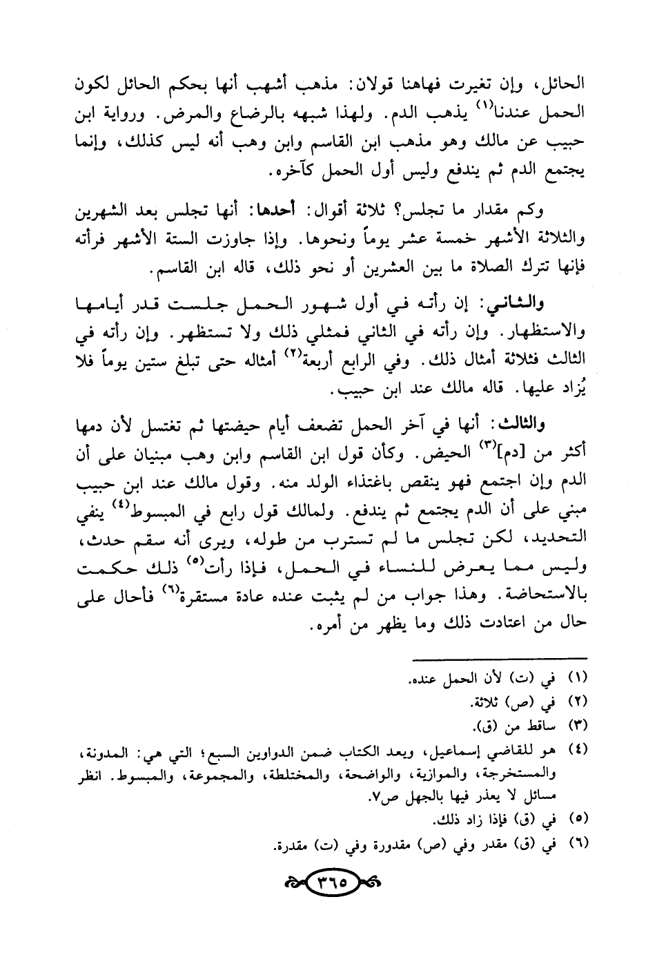 والثالث: أنها في آخر الحمل تضعف أيام حيضتها ثم تغتسل لأن دمها أكثر من [دم]، (¬3) الحيض. وكأن قول ابن القاسم وابن وهب مبنيان على أن الدم وإن اجتمع فهو ينقص باغتذاء الولد منه. وقول مالك عند ابن حبيب مبني على أن الدم يجتمع ثم يندفع. ولمالك قول رابع في المبسوط (¬4) ينفي التحديد، لكن تجلس ما لم تسترب من طوله، ويرى أنه سقم حدث، وليس مما يعرض للنساء في الحمل، فإذا رأت (¬5) ذلك حكمت بالاستحاضة. وهذا جواب من لم يثبت عنده عادة مستقرة (¬6) فأحال على حال من اعتادت ذلك وما يظهر من أمره.