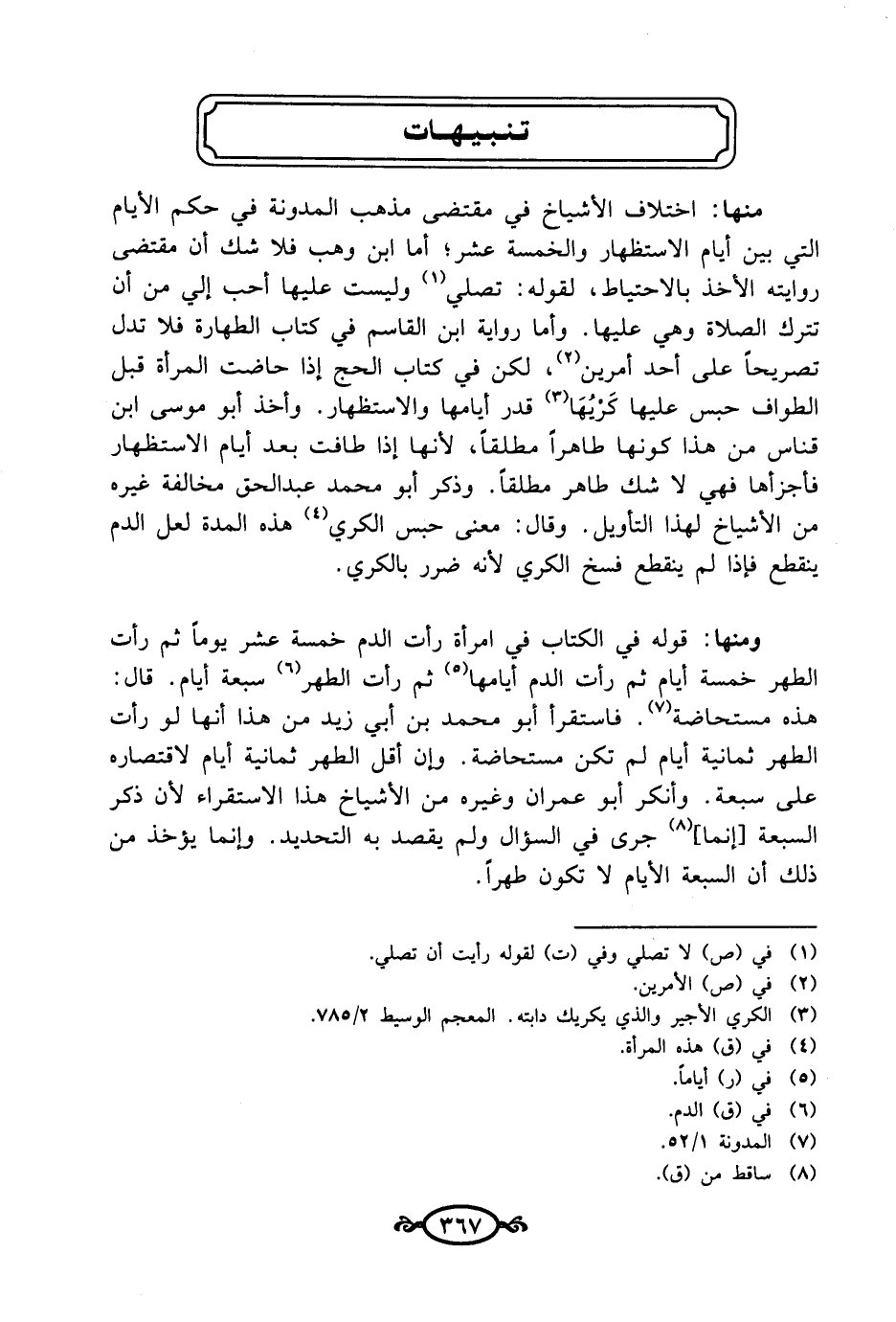 منها: اختلاف الأشياخ في مقتضى مذهب المدونة في حكم الأيام التي بين أيام الاستظهار والخمسة عشر؛ أما ابن وهب فلا شك أن مقتضى روايته الأخذ بالاحتياط، لقوله: تصلي (¬1) وليست عليها أحب إلى من أن تترك الصلاة وهي عليها. وأما رواية ابن القاسم في كتاب الطهارة فلا تدل تصريحاً على أحد أمرين (¬2)، لكن في كتاب الحج إذا حاضت المرأة قبل الطواف حبس عليها كَرْيُهَا (¬3) قدر أيامها والاستظهار. وأخذ أبو موسى ابن قناس من هذا كونها طاهراً مطلقاً؛ لأنها إذا طافت بعد أيام الاستظهار فأجزأها فهي لا شك طاهر مطلقاً. وذكر أبو محمد عبد الحق مخالفة غيره من الأشياخ لهذا التأويل. وقال: معنى حبس الكري (¬4) هذه المدة لعل الدم ينقطع فإذا لم ينقطع فسخ الكري لأنه ضرر بالكري.