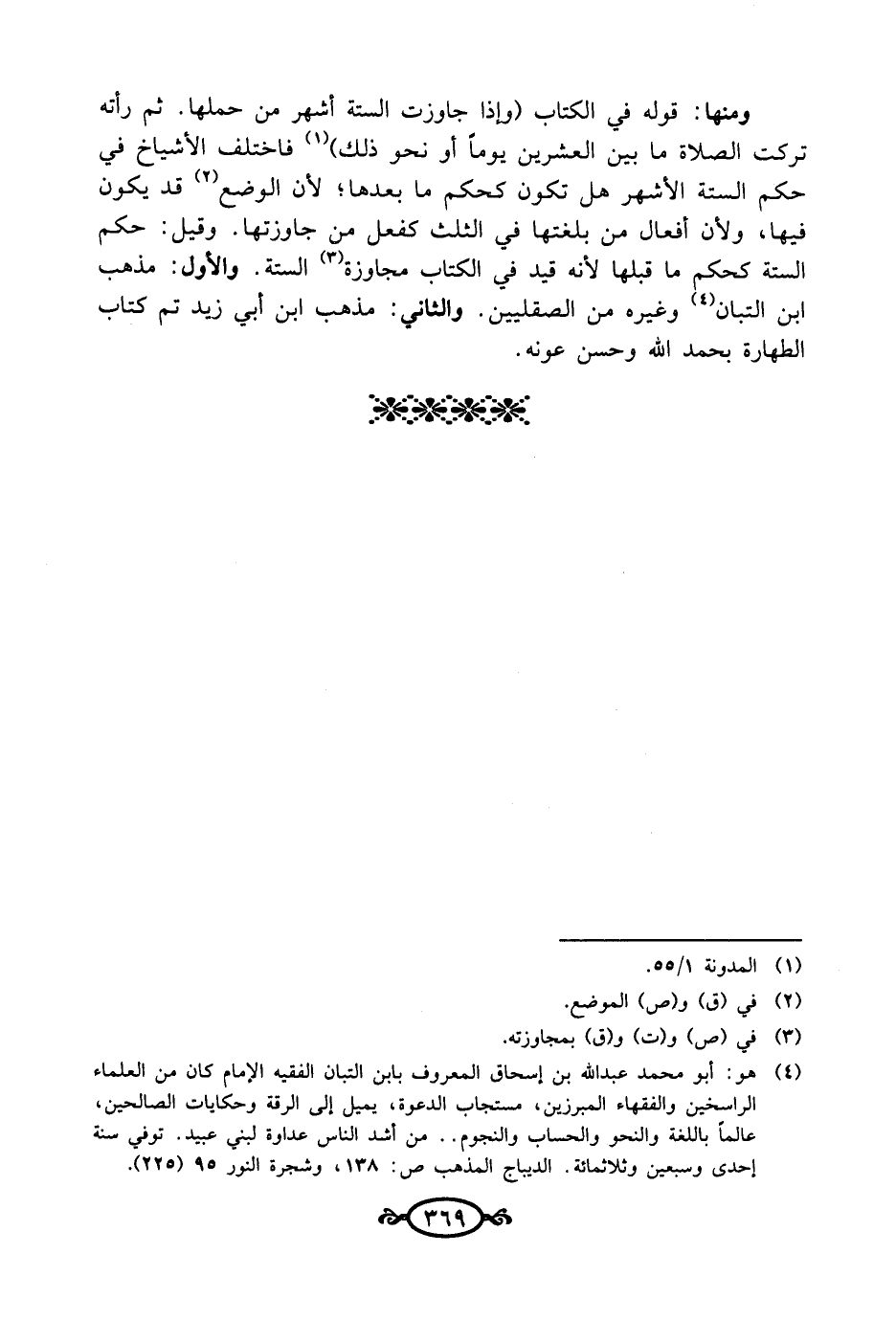 ومنها: قوله في الكتاب (وإذا جاوزت الستة أشهر من حملها. ثم رأته تركت الصلاة ما بين العشرين يوماً أو نحو ذلك) (¬1) فاختلف الأشياخ في حكم الستة الأشهر هل تكون كحكم ما بعدها؛ لأن الوضع (¬2) قد يكون فيها، ولأن أفعال من بلغتها في الثلث كفعل من جاوزتها. وقيل: حكم الستة كحكم ما قبلها لأنه قيد في الكتاب مجاوزة (¬3) الستة. والأول: مذهب ابن التبان (¬4) وغيره من الصقليين. والثاني: مذهب ابن أبي زيد تم كتاب الطهارة بحمد الله وحسن عونه.