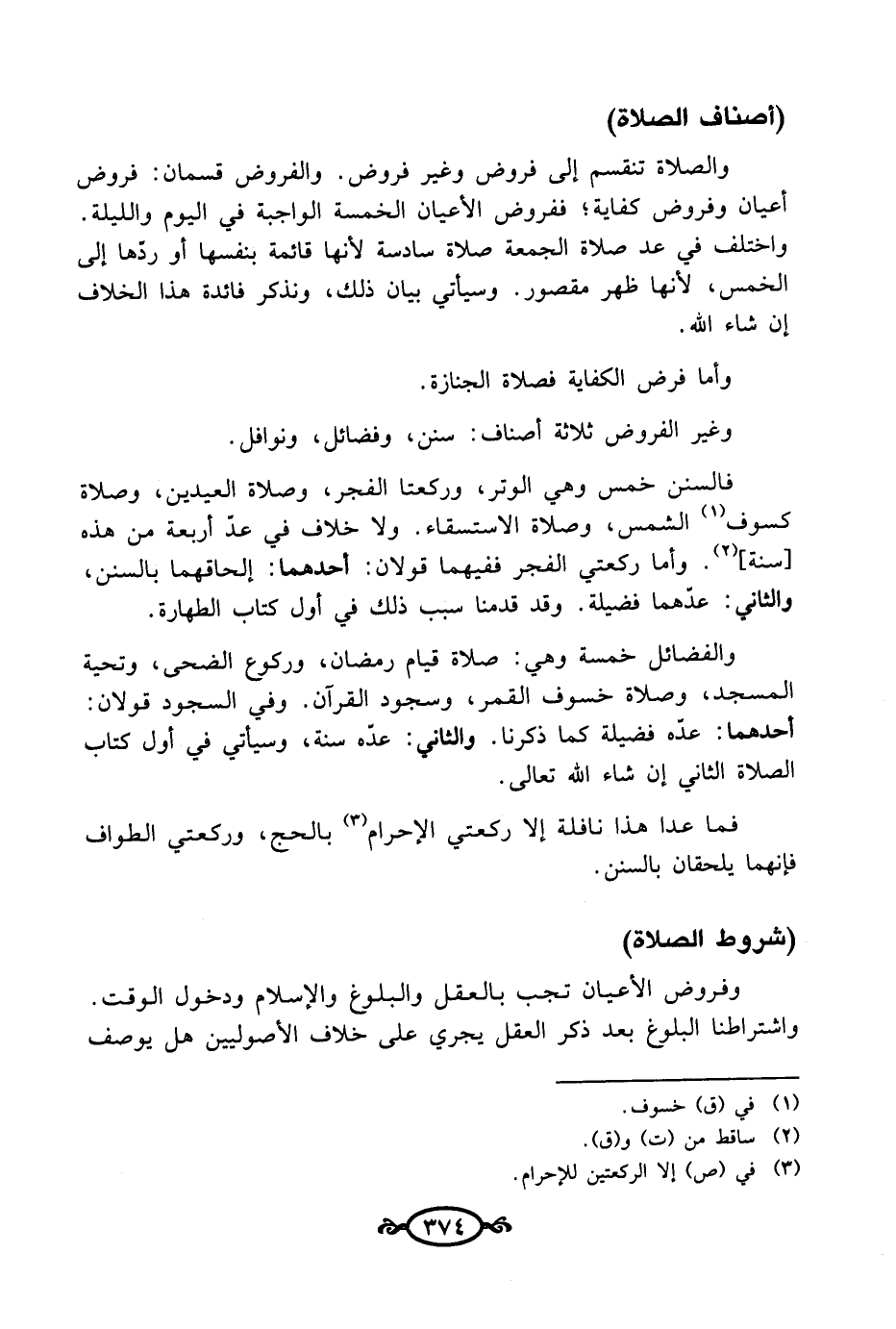 وفروض الأعيان تجب بالعقل والبلوغ والإسلام ودخول الوقت. واشتراطنا البلوغ بعد ذكر العقل يجري على خلاف الأصوليين هل يوصف