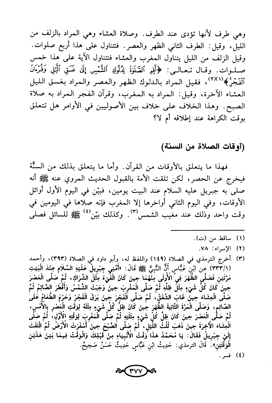 (¬3) أخرج الترمذي في الصلاة (149) واللفظ له، وأبو داود في الصلاة (393)، وأحمد (1/ 333) عن ابنِ عَبّاس أَنَ النَّبِيَّ - صلى الله عليه وسلم - قَالَ: "أَمَّنِي جِبرِيلُ عَلَيهِ السلام عِنْدَ البَيتِ مَرَّتَينِ فَصَلي الظهرَ فِيِ الأُولَى مِنهُمَا حِينَ كَانَ الفَيءُ مِثلَ الشراكِ، ثُم صلى العَصرَ حِينَ كَانَ كُل شَئء مِثل ظِلِّهِ ثُمَّ صلى المَغرِبَ حِين وَجَبَت الشَّمْسُ وَأَفطَرَ الصَّائِمُ ثُمَّ صَلَّى العِشَاءَ حِينَ غَابَ الشَّفَقُ، ثُم صَلَّى الفَجرَ حِينَ بَرقَ الفَجْرُ وَحَرُمَ الطعَامُ عَلى الصَّائِم، وصَلَّى المَرَّةَ الثَّانِيَةَ الظُّهْرَ حِينَ كَانَ ظِلُّ كُلِّ شَيءٍ مِثْلَهُ لِوَقتِ العَصْرِ بالأَمْسِ، ثُم صَلى العَصْرَ حِينَ كَانَ ظِلُّ كُلِّ شَيءٍ مِثْلَيهِ ثُم صَلَّى المَغْرِبَ لِوَقْتِهِ الأَوَّلِ، ثُمَّ صَلَّى العِشَاءَ الآخِرَةَ حِينَ ذهَبَ ثلُثُ اللَّيْلِ، ثُمَّ صَلَّى الصُّبْحَ حِينَ أَسْفَرَتْ الأَرْضُ ثُمَّ التَفَتَ إِلَيَّ جِبرِيلُ فَقَالَ: يَا مُحَمدُ هذا وَقتُ الأَنبِيَاءِ من قَبلكَ وَالوَقْتُ فِيمَا بَينَ هَذَيْنِ الوَقتَينِ". قَالَ الترمذي: حَدِيثُ ابْنِ عَبَّاسِ حَدِيثٌ حَسَنٌ صَحِيحٌ.