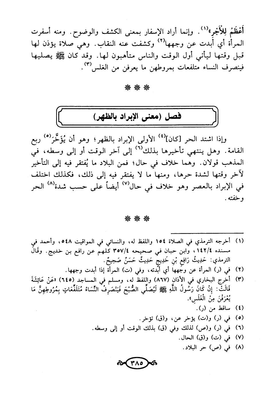 أَعْظَمُ لِلْأَجْرِ" (¬1). وإنما أراد الإسفار بمعنى الكشف والوضوح. ومنه أسفرت المرأة أي أبدت عن وجهها (¬2) وكشفت عنه النقاب. وهي صلاة يؤذن لها قبل وقتها ليأتي أول الوقت والناس متأهبون لها. وقد كان - صلى الله عليه وسلم - يصليها فينصرف النساء متلفعات بمروطهن ما يعرفن من الغلس (¬3).