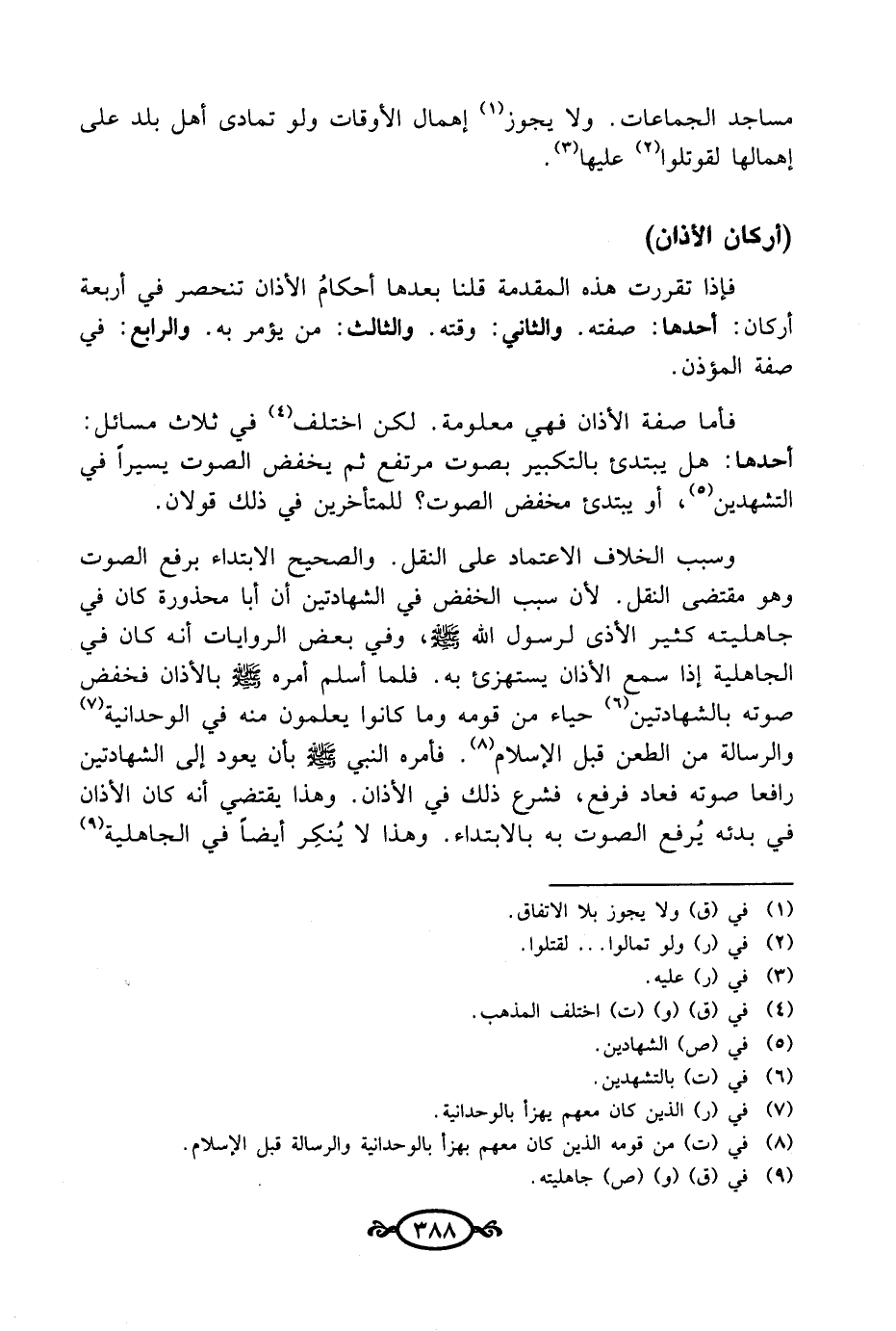 فإذا تقررت هذه المقدمة قلنا بعدها أحكامُ الأذان تنحصر في أربعة أركان: أحدها: صفته. والثاني: وقته. والثالث: من يؤمر به. والرابع: في صفة المؤذن.