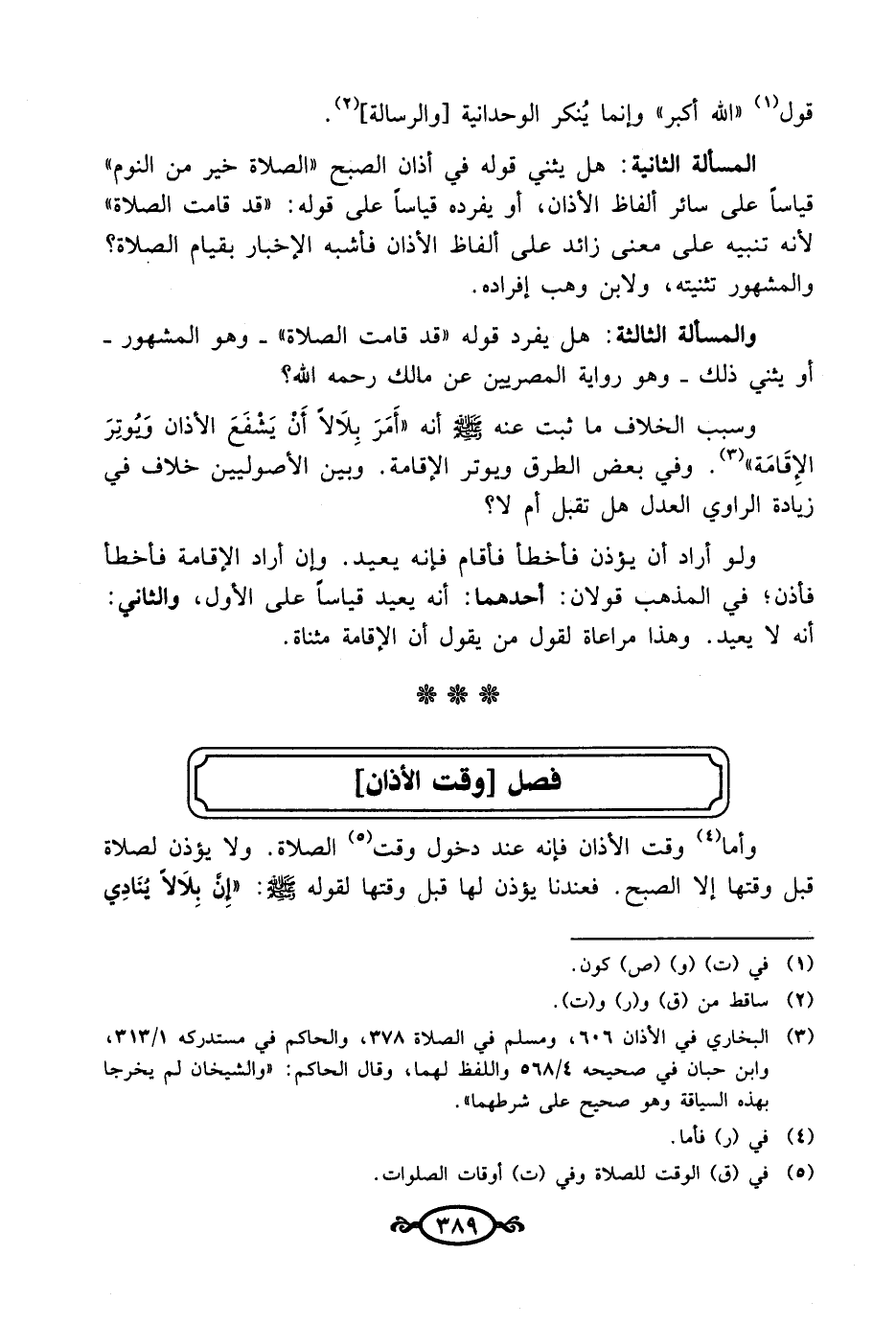 المسألة الثانية: هل يثني قوله في أذان الصبح "الصلاة خير من النوم" قياساً على سائر ألفاظ الأذان، أو يفرده قياساً على قوله:"قد قامت الصلاة" لأنه تنبيه على معنى زائد على ألفاظ الأذان فأشبه الإخبار بقيام الصلاة؟ والمشهور تثنيته، ولابن وهب إفراده.
