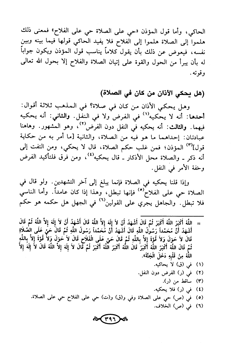 وإذا قلنا يحكيه في الصلاة فإنما يبلغ إلى آخر التشهدين. ولو قال في الصلاة حي على الفلاح (¬5) فإنها تبطل، وهذا إذا كان عامداً وأما الناسي فلا تبطل. والجاهل يجري على القولين (¬6) في الجهل هل حكمه هو حكم