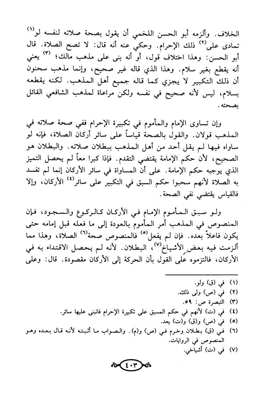 الخلاف. وألزمه أبو الحسن اللخمي أن يقول بصحة صلاته لنفسه لو (¬1) تمادى على (¬2) ذلك الإحرام. وحكي عنه أنه قال: لا تصح الصلاة. قال أبو الحسن: وهذا اختلاف قول، أو أنه بني على مذهب مالك؛ (¬3) يعني أنه يقطع بغير سلام. وهذا الذي قاله غير صحيح، وإنما مذهب سحنون أن ذلك التكبير لا يجزي كما قاله جميع أهل المذهب. لكنه يقطعه بسلام، ليس لأنه صحيح في نفسه ولكن مراعاة لمذهب الشافعي القائل بصحته.