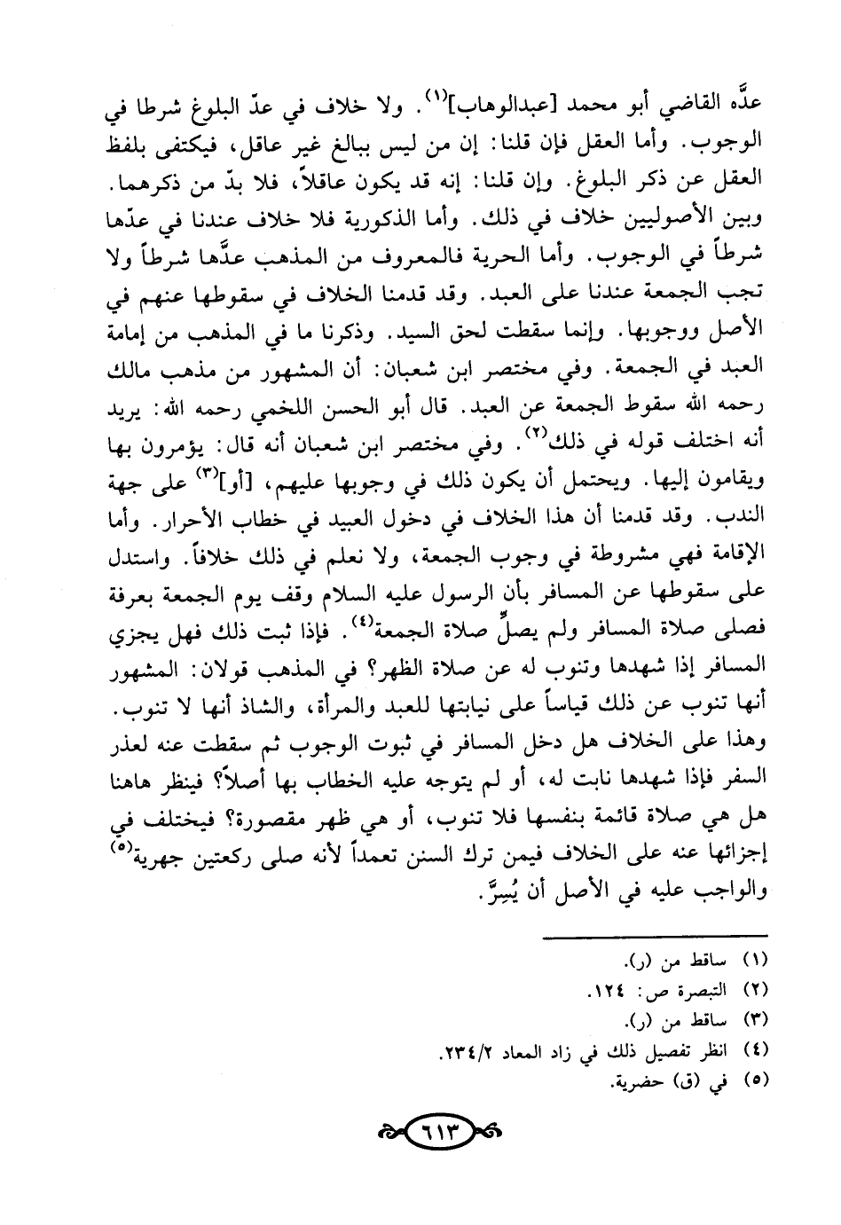 عدَّه القاضي أبو محمد [عبد الوهاب] (¬1). ولا خلاف في عدّ البلوغ شرطا في الوجوب. وأما العقل فإن قلنا: إن من ليس ببالغ غير عاقل، فيكتفى بلفظ العقل عن ذكر البلوغ. وإن قلنا: إنه قد يكون عاقلاً، فلا بدّ من ذكرهما. وبين الأصوليين خلاف في ذلك. وأما الذكورية فلا خلاف عندنا في عدها شرطاً في الوجوب. وأما الحرية فالمعروف من المذهب عدَّها شرطاً ولا تجب الجمعة عندنا على العبد. وقد قدمنا الخلاف في سقوطها عنهم في الأصل ووجوبها. وإنما سقطت لحق السيد. وذكرنا ما في المذهب من إمامة العبد في الجمعة. وفي مختصر ابن شعبان: أن المشهور من مذهب مالك رحمه الله سقوط الجمعة عن العبد. قال أبو الحسن اللخمي رحمه الله: يريد أنه اختلف قوله في ذلك (¬2). وفي مختصر ابن شعبان أنه قال: يؤمرون بها ويقامون إليها. ويحتمل أن يكون ذلك في وجوبها عليهم، [أو] (¬3) على جهة الندب. وقد قدمنا أن هذا الخلاف في دخول العبيد في خطاب الأحرار. وأما الإقامة فهي مشروطة في وجوب الجمعة، ولا نعلم في ذلك خلافاً. واستدل على سقوطها عن المسافر بأن الرسول عليه السلام وقف يوم الجمعة بعرفة فصلى صلاة المسافر ولم يصلِّ صلاة الجمعة (¬4). فإذا ثبت ذلك فهل يجزي المسافر إذا شهدها وتنوب له عن صلاة الظهر؟ في المذهب قولان: المشهور أنها تنوب عن ذلك قياسًا على نيابتها للعبد والمرأة، والشاذ أنها لا تنوب. وهذا على الخلاف هل دخل المسافر في ثبوت الوجوب ثم سقطت عنه لعذر السفر فإذا شهدها نابت له، أو لم يتوجه عليه الخطاب بها أصلاً؟ فينظر هاهنا هل هي صلاة قائمة بنفسها فلا تنوب، أو هي ظهر مقصورة؟ فيختلف في إجزائها عنه على الخلاف فيمن ترك السنن تعمدًا لأنه صلى ركعتين جهرية (¬5) والواجب عليه في الأصل أن يُسِرَّ.
