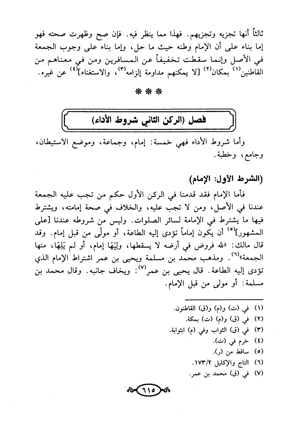 فأما الإمام فقد قدمنا في الركن الأول حكم من تجب عليه الجمعة عندنا في الأصل، ومن لا تجب عليه، والخلاف في صحة إمامته، ويشترط فيها ما يشترط في الإمامة لسائر الصلوات. وليس من شروطه عندنا أعلى المشهور] (¬5) أن يكون إماماً تؤدى إليه الطاعة، أو مولىّ من قبل إمام. وقد قال مالك:"لله فروض في أرضه لا يسقطها، وليَهَا إمام، أو لم يَلِهَا، منها الجمعة" (¬6). ومذهب محمد بن مسلمة ويحيى بن عمر اشتراط الإمام الذي تؤدى إليه الطاعة. قال يحيي بن عمر (¬7): ويخاف جانبه. وقال محمد بن مسلمة: أو مولى من قبل الإمام.