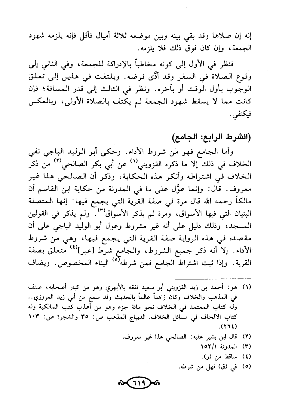 وأما الجامع فهو من شروط الأداء. وحكى أبو الوليد الباجي نفي الخلاف في ذلك إلا ما ذكره القزويني (¬1) عن أبي بكر الصالحين (¬2) من ذكر الخلاف في اشتراطه وأنكر هذه الحكاية، وذكر أن الصالحي هذا غير معروف. قال: وإنما عوَّل على ما في المدونة من حكايته ابن القاسم أن مالكًا رحمه الله قال مرة في صفة القرية التي يجمع فيها, إنها المتصلة البنيان التي فيها الأسواق، ومرة لم يذكر الأسواق (¬3). ولم يذكر في القولين المسجد، وذلك دليل على أنه غير مشروط وعول أبو الوليد الباجي على أن مقصده في هذه الرواية صفة القرية التي يجمع فيها، وهي من شروط الأداء. إلا أنه ذكر جميع الشروط، والجامع شرط [غير] (¬4) متعلق بصفة القرية. وإذا ثبت اشتراط الجامع فمن شرطه (¬5) البناء المخصوص. ويضاف