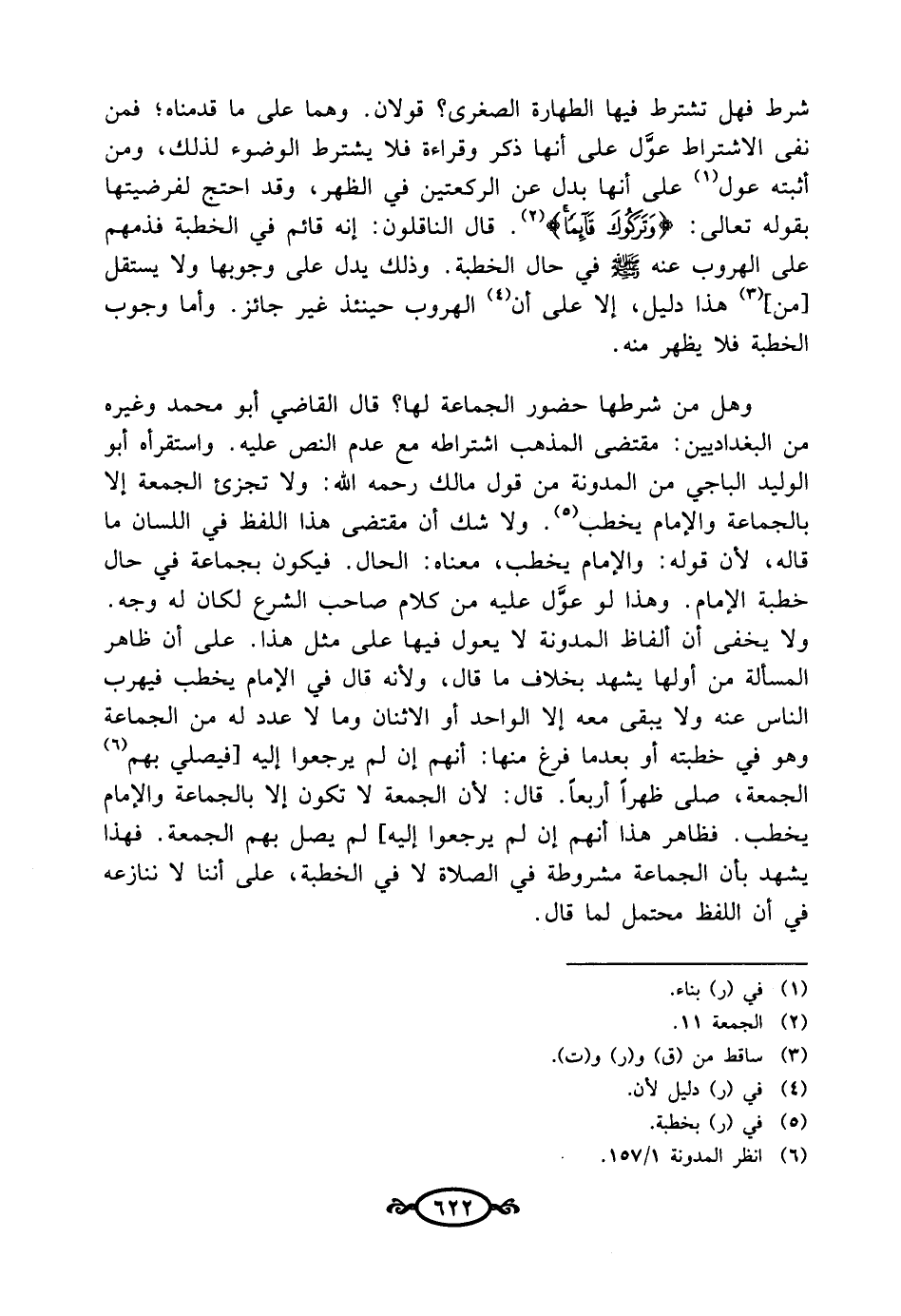 وهل من شرطها حضور الجماعة لها؟ قال القاضي أبو محمد وغيره من البغداديين: مقتضى المذهب اشتراطه مع عدم النص عليه. واستقرأه أبو الوليد الباجي من المدونة من قول مالك رحمه الله: ولا تجزئ الجمعة إلا بالجماعة والإمام يخطب (¬5). ولا شك أن مقتضى هذا اللفظ في اللسان ما قاله, لأن قوله: والإمام يخطب، معناه: الحال. فيكون بجماعة في حال خطبة الإمام. وهذا لو عوَّل عليه من كلام صاحب الشرع لكان له وجه. ولا يخفى أن ألفاظ المدونة لا يعول فيها على مثل هذا. على أن ظاهر المسألة من أولها يشهد بخلاف ما قال، ولأنه قال في الإمام يخطب فيهرب الناس عنه ولا يبقى معه إلا الواحد أو الاثنان وما لا عدد له من الجماعة وهو في خطبته أو بعد ما فرغ منها: أنهم إن لم يرجعوا إليه [فيصلي بهم (¬6) الجمعة، صلى ظهراً أربعاً. قال: لأن الجمعة لا تكون إلا بالجماعة والإمام يخطب. فظاهر هذا أنهم إن لم يرجعوا إليه] لم يصل بهم الجمعة. فهذا يشهد بأن الجماعة مشروطة في الصلاة لا في الخطبة، على أننا لا ننازعه في أن اللفظ محتمل لما قال.
