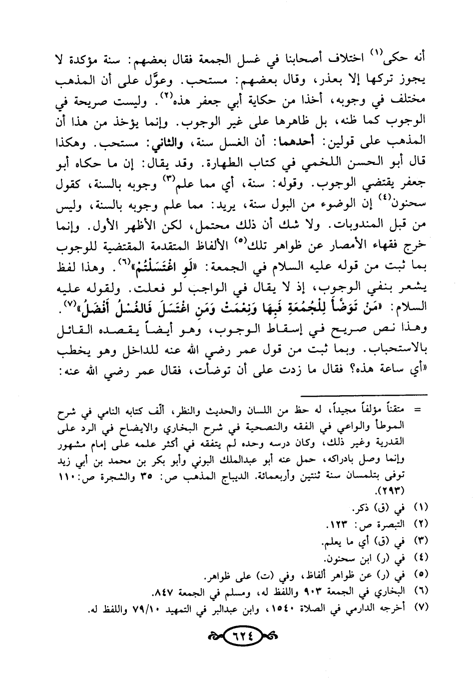 أنه حكى (¬1) اختلاف أصحابنا في غسل الجمعة فقال بعضهم: سنة مؤكدة لا يجوز تركها إلا بعذر، وقال بعضهم: مستحب. وعوَّل على أن المذهب مختلف في وجوبه، أخذا من حكاية أبي جعفر هذه (¬2). وليست صريحة في الوجوب كما ظنه، بل ظاهرها على غير الوجوب. وإنما يؤخذ من هذا أن المذهب على قولين: أحدهما: أن الغسل سنة، والثاني: مستحب. وهكذا قال أبو الحسن اللخمي في كتاب الطهارة. وقد يقال: إن ما حكاه أبو جعفر يقتضي الوجوب. وقوله: سنة، أي مما علم (¬3) وجوبه بالسنة، كقول سحنون (¬4) إن الوضوء من البول سنة، يريد: مما علم وجوبه بالسنة، وليس من قبل المندوبات. ولا شك أن ذلك محتمل، لكن الأظهر الأول. وإنما خرج فقهاء الأمصار عن ظواهر تلك (¬5) الألفاظ المتقدمة المقتضية للوجوب بما ثبت من قوله عليه السلام في الجمعة:"لَوِ اغْتَسَلْتُمْ" (¬6). وهذا لفظ يشعر بنفي الوجوب، إذ لا يقال في الواجب لو فعلت. ولقوله عليه السلام:"مَنْ تَوَضأَ لِلْجُمُعَةِ فَبِهَا وَنعْمَتْ وَمَنِ اغْتَسَلَ فَالغُسْلُ أَفْضَلُ" (¬7). وهذا نص صريح في إسقاط الوجوب، وهو أيضاً يقصده القائل بالاستحباب. وبما ثبت من قول عمر رضي الله عنه للداخل وهو يخطب "أي ساعة هذه؟ فقال ما زدت على أن توضأت، فقال عمر رضي الله عنه: