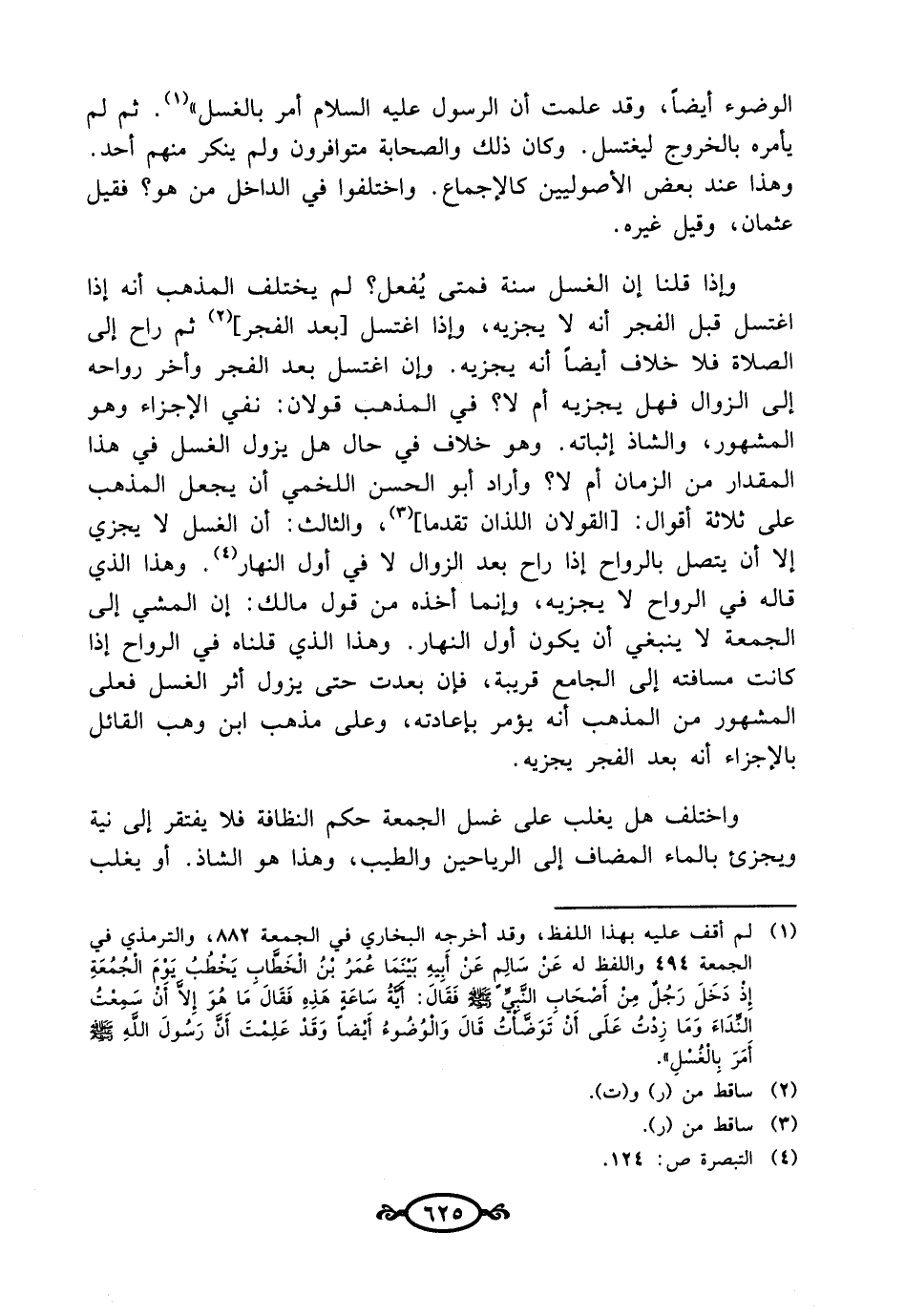 وإذا قلنا إن الغسل سنة فمتى يُفعل؟ لم يختلف المذهب أنه إذا اغتسل قبل الفجر أنه لا يجزيه، وإذا اغتسل [بعد الفجر] (¬2) ثم راح إلى الصلاة فلا خلاف أيضًا أنه يجزيه. وإن اغتسل بعد الفجر وأخر رواحه إلى الزوال فهل يجزيه أم لا؟ في المذهب قولان: نفي الإجزاء وهو المشهور، والشاذ إثباته. وهو خلاف في حال هل يزول الغسل في هذا المقدار من الزمان أم لا؟ وأراد أبو الحسن اللخمي أن يجعل المذهب على ثلاثة أقوال: [القولان اللذان تقدما] (¬3)،والثالث: أن الغسل لا يجزي إلا أن يتصل بالرواح إذا راح بعد الزوال لا في أول النهار (¬4).وهذا الذي قاله في الرواح لا يجزيه، وإنما أخذه من قول مالك: إن المشي إلى الجمعة لا ينبغي أن يكون أول النهار. وهذا الذي قلناه في الرواح إذا كانت مسافته إلى الجامع قريبة، فإن بعدت حتى يزول أثر الغسل فعلى المشهور من المذهب أنه يؤمر بإعادته، وعلى مذهب ابن وهب القائل بالإجزاء أنه بعد الفجر يجزيه.