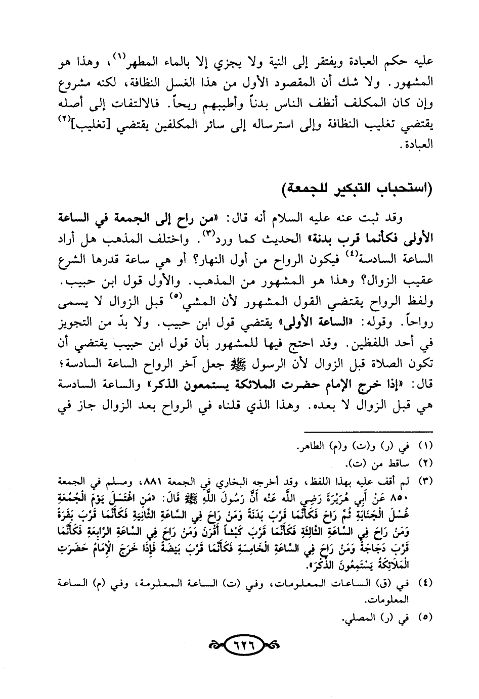 (¬3) لم أقف عليه بهذا اللفظ، وقد أخرجه البخاري في الجمعة 881، ومسلم في الجمعة 850 عَنْ أَبِي هُرَيْرَةَ رَضِى الله عَنْه أَنَّ رَسُولَ اللهِ - صلى الله عليه وسلم -قَالَ: "مَنِ اغْتَسَلَ يَوْمَ الْجُمعَةِ غُسْلَ الْجَنَابَةِ ثُمَّ رَاحَ فَكَأنَمَا قَرَّبَ بَدَنَةَ وَمَنْ رَاحَ فِي السَّاعةِ الثَّانِيَة فَكَأَنَمَا قَرَّبَ بَقَرَةً وَمَنْ رَاَحَ فِي السَّاعِةِ الثَّالِثَةِ فَكَأنَمَا قَرَّبَ كَبْشاً وَمَنْ رَاَحَ فِي السَّاعَةِ الرَّابعةِ فَكَأَنَّمَا قّرَّب دَجَاجَةً وَمَنْ رَاَحَ فِي السَّاعَةِ الْخَامِسَةِ فَكَأَنَمَا قَرَّبَ بَيضْةً فإِذَا خَرَجَ الإِمامُ حَضَرَتِ المَلائِكَةُ يَسْتِمُعونَ الذكْرَ".