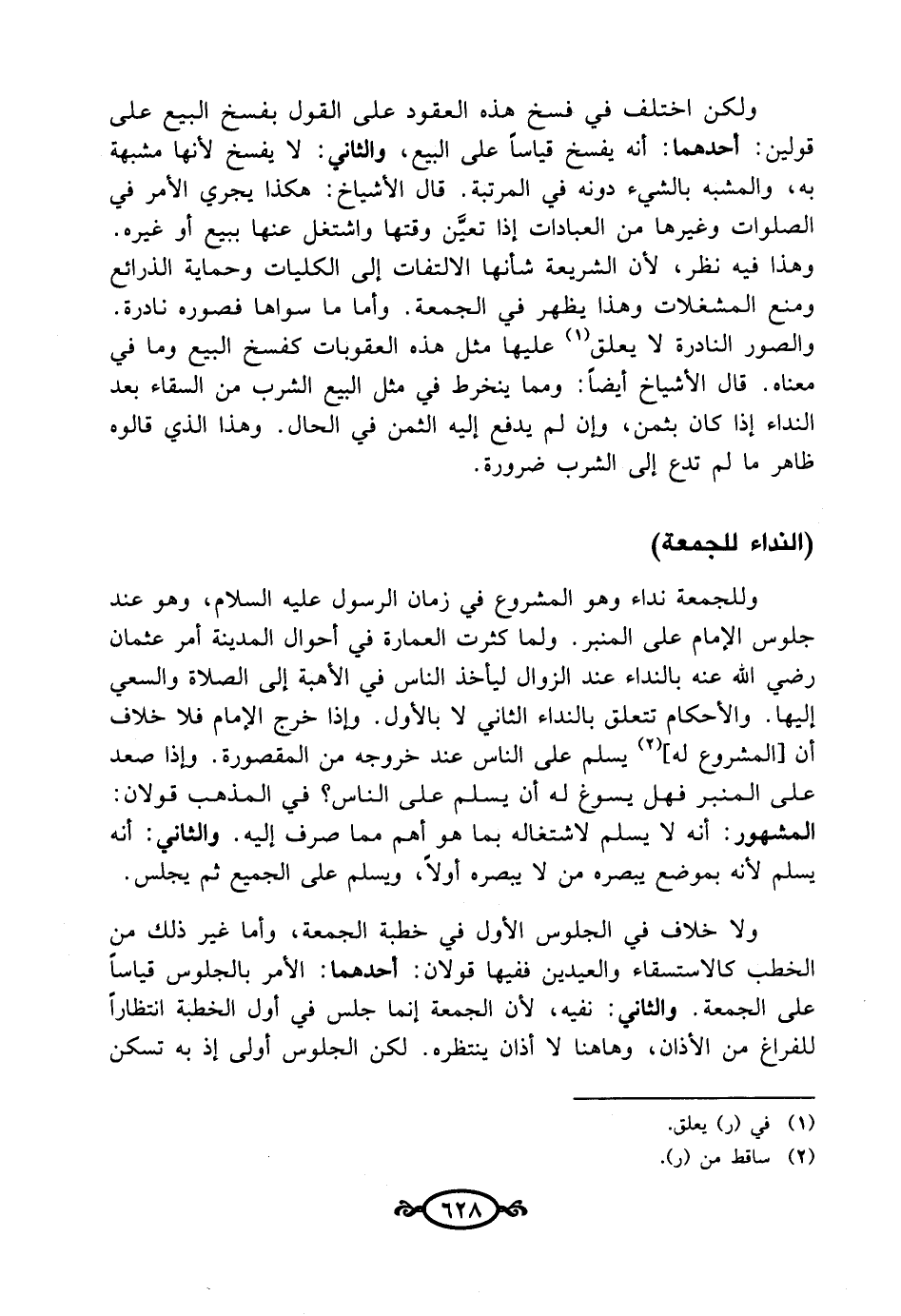 ولكن اختلف في فسخ هذه العقود على القول بفسخ البيع على قولين: أحدهما: أنه يفسخ قياساً على البيع، والثاني: لا يفسخ لأنها مشبهة به، والمشبه بالشيء دونه في المرتبة. قال الأشياخ: هكذا يجري الأمر في الصلوات وغيرها من العبادات إذا تعيَّن وقتها واشتغل عنها ببيع أو غيره. وهذا فيه نظر, لأن الشريعة شأنها الالتفات إلى الكليات وحماية الذرائع ومنع المشغلات وهذا يظهر في الجمعة. وأما ما سواها فصوره نادرة. والصور النادرة لا يعلق (¬1) عليها مثل هذه العقوبات كفسخ البيع وما في معناه. قال الأشياخ أيضًا: ومما ينخرط في مثل البيع الشرب من السقاء بعد النداء إذا كان بثمن، وإن لم يدفع إليه الثمن في الحال. وهذا الذي قالوه ظاهر ما لم تدع إلى الشرب ضرورة.