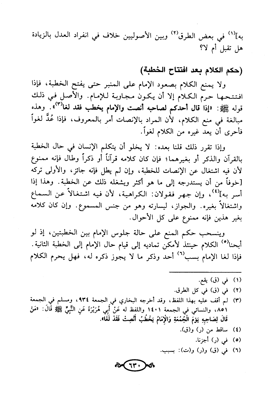 وينسحب حكم المنع على حالة جلوس الإمام بين الخطبتين، إذ لو أبحنا (¬5) الكلام حينئذ لأمكن تماديه إلى قيام حال الإمام إلى الخطبة الثانية. فإذا لغا الإمام بسب (¬6) أحد وذكر ما لا يجوز ذكره له، فهل يحرم الكلام
