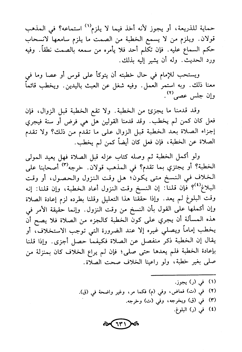ولو أكمل الخطبة ثم وصله كتاب عزله قبل الصلاة فهل يعيد المولى الخطبة؟ أو يجتزي بما تقدم؟ في المذهب قولان. خرجه (¬3) أصحابنا على الخلاف في النسخ متى يكون؛ هل وقت النزول والحصول، أو وقت البلاغ (¬4)؟ فإن قلنا: إن النسخ وقت النزول أعاد الخطبة، وإن قلنا: إنه وقت البلوغ لم يعد. وإذا حققنا هذا التعليل وقلنا بطرده لزم إعادة الصلاة وإن أكملها على القول بأن النسخ من وقت النزول. وإنما حقيقة الأمر في هذه المسألة أن يجري على كون الخطبة كالجزء من الصلاة فلا يصح أن يخطب إمامًا ويصلي غيره إلا عند الضرورة التي توجب الاستخلاف، أو يقال إن الخطبة ذكر منفصل عن الصلاة فكيفما حصل أجزى. وإذا قلنا بإعادة الخطبة فلم يعدها حتى صلى؛ فإن لم يراع الخلاف كان بمنزلة من صلى بغير خطبة، ولو راعينا الخلاف صحت الصلاة.