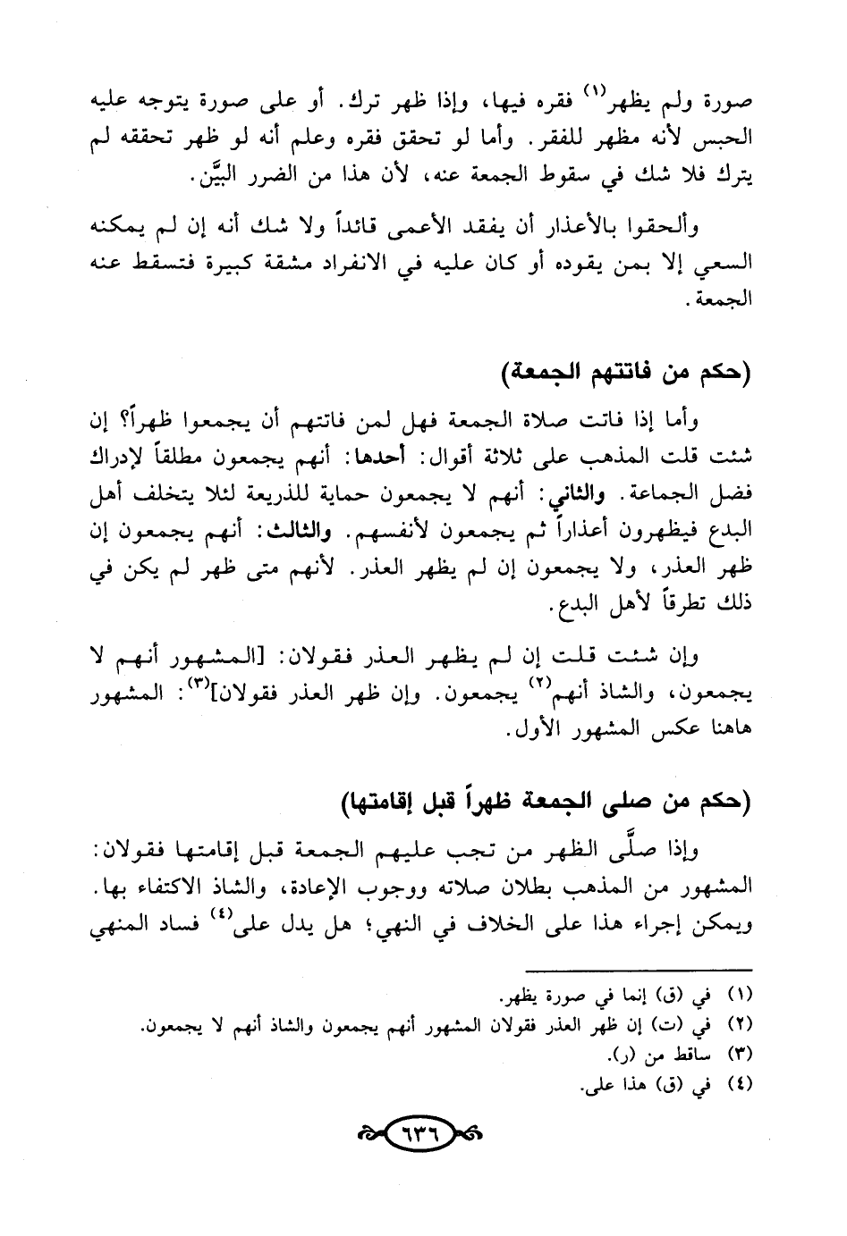 وإذا صلَّى الظهر من تجب عليهم الجمعة قبل إقامتها فقولان: المشهور من المذهب بطلان صلاته ووجوب الإعادة، والشاذ الاكتفاء بها. ويمكن إجراء هذا على الخلاف في النهي؛ هل يدل على (¬4) فساد المنهي