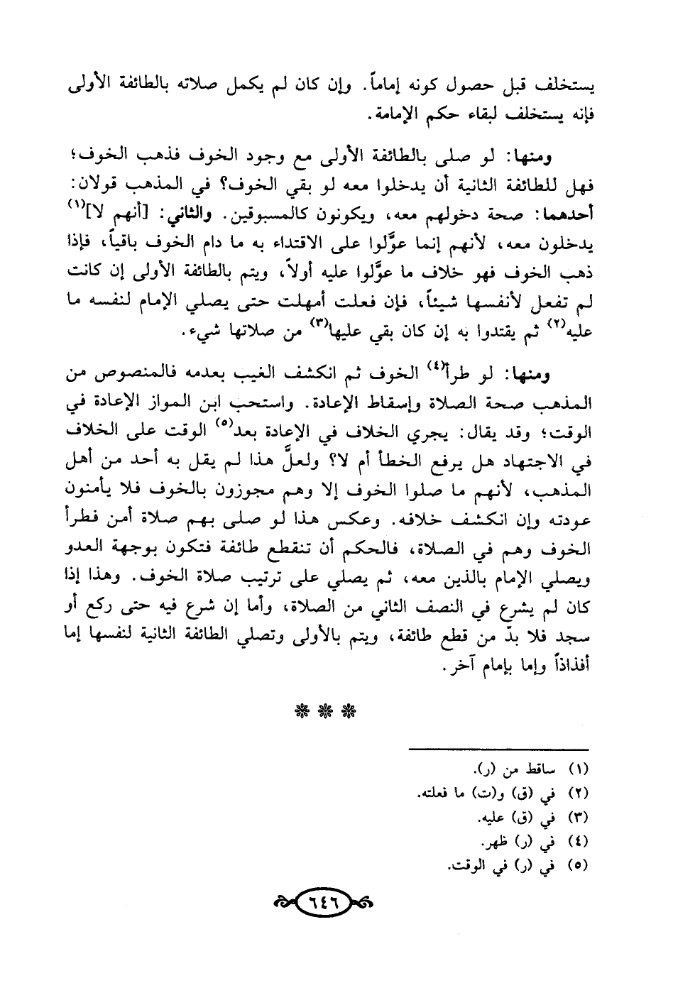 ومنها: لو طرأ (¬4) الخوف ثم انكشف الغيب بعدمه فالمنصوص من المذهب صحة الصلاة وإسقاط الإعادة. واستحب ابن المواز الإعادة في الوقت؛ وقد يقال: يجري الخلاف في الإعادة بعد (¬5) الوقت على الخلاف في الاجتهاد هل يرفع الخطأ أم لا؟ ولعلَّ هذا لم يقل به أحد من أهل المذهب, لأنهم ما صلوا الخوف إلا وهم مجوزون بالخوف فلا يأمنون عودته وإن انكشف خلافه. وعكس هذا لو صلى بهم صلاة أمن فطرأ الخوف وهم في الصلاة، فالحكم أن تنقطع طائفة فتكون بوجهة العدو ويصلي الإمام بالذين معه، ثم يصلي على ترتيب صلاة الخوف. وهذا إذا كان لم يشرع في النصف الثاني من الصلاة, وأما إن شرع فيه حتى ركع أو سجد فلا بد من قطع طائفة، ويتم بالأولى وتصلي الطائفة الثانية لنفسها إما أفذاذاً وإما بإمام آخر.
