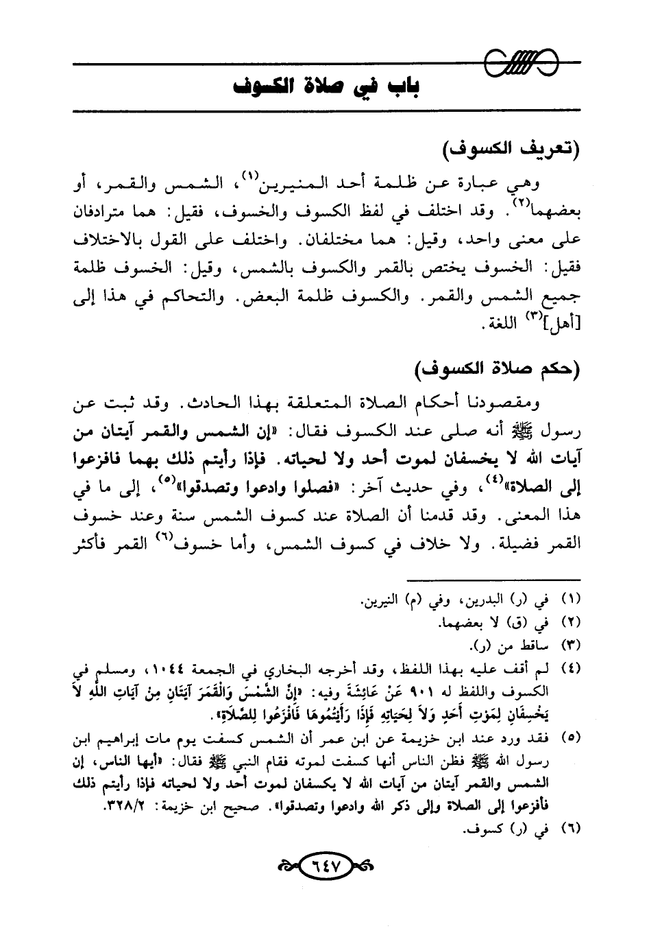 (¬5) فقد ورد عند ابن خزيمهّ عن ابن عمر أن الشمس كسفت يوم مات إبراهيم ابن رسول الله -صلى الله عليه وسلم- فظن الناس أنها كسفت لموته فقام النبي-صلى الله عليه وسلم-فقال:"أيها الناس، إن الشمس والقمر آيتان من آيات الله لا يكسفان لموت أحد ولا لحياته فإذا رأيتم ذلك فأفزعوا إلى الصلاة وإلى ذكر الله وأدعوا وتصدقوا". صحيح ابن خزيمة: 2/ 328.