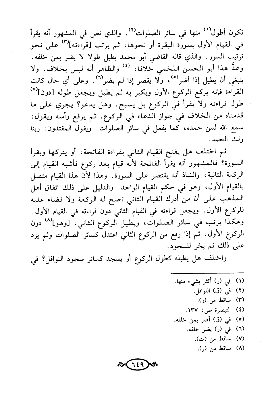 ثم اختلف هل يفتح القيام الثاني بقراءة الفاتحة، أو يتركها ويقرأ السورة؟ فالمشهور أنه يقرأ الفاتحة لأنه قيام بعد ركوع فأشبه القيام إلى الركعة الثانية، والشاذ أنه يقتصر على السورة. وهذا لأن هذا القيام متصل بالقيام الأول، وهو في حكم القيام الواحد. والدليل على ذلك اتفاق أهل المذهب على أن من أدرك القيام الثاني تصح له الركعة ولا قضاء عليه للركوع الأول. ويجعل قراءته في القيام الثاني دون قراءته في القيام الأول. وهكذا يرتب في سائر الصلوات، ويطيل الركوع الثاني، [وهو] (¬8) دون الركوع الأول. ثم إذا رفع من الركوع الثاني اعتدل كسائر الصلوات ولم يزد على ذلك ثم يخر للسجود.