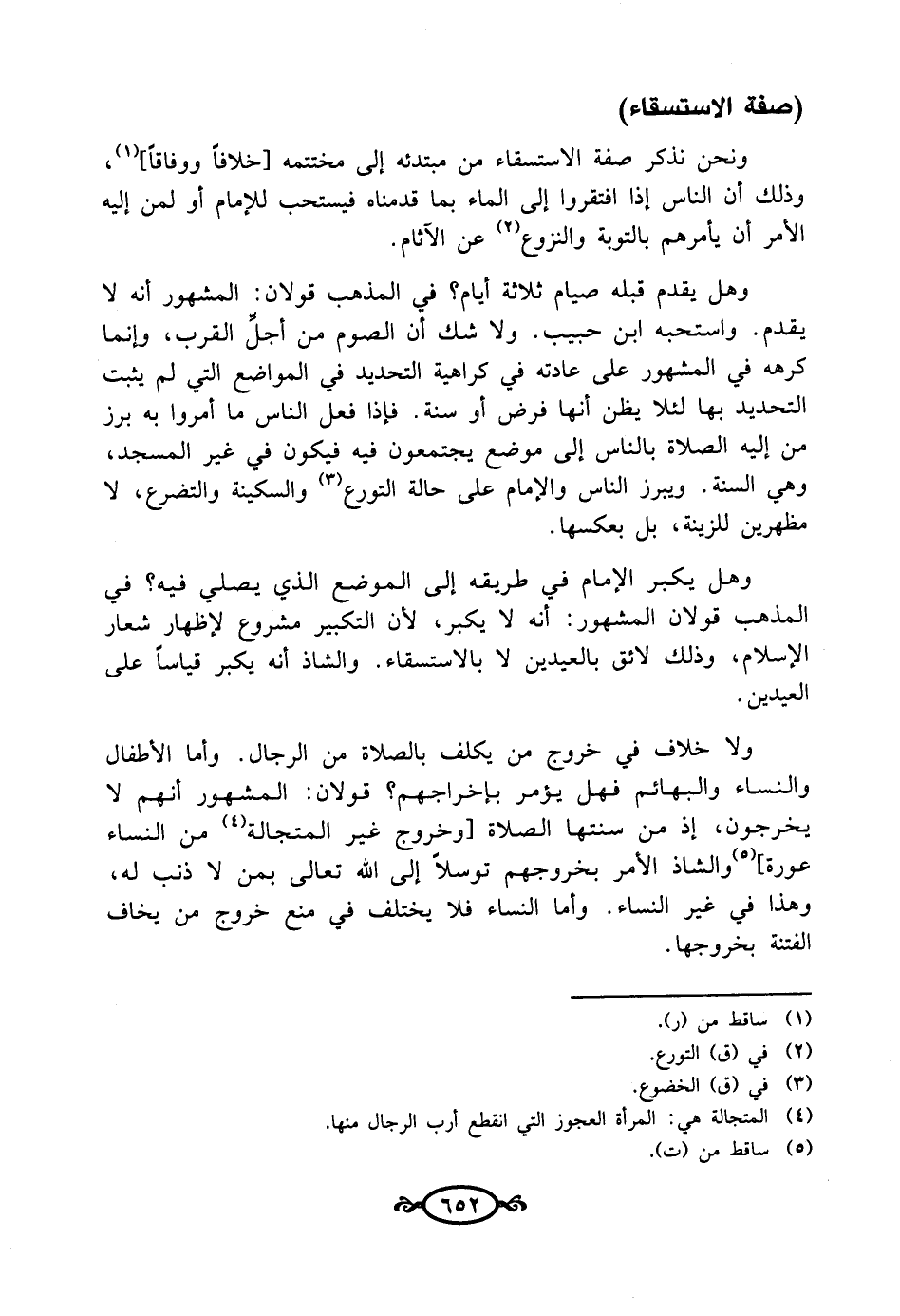 ولا خلاف في خروج من يكلف بالصلاة من الرجال. وأما الأطفال والنساء والبهائم فهل يؤمر بإخراجهم؟ قولان: المشهور أنهم لا يخرجون، إذ من سنتها الصلاة [وخروج غير المتجالة (¬4) من النساء عورة] (¬5) والشاذ الأمر بخروجهم توسلاً إلى الله تعالى بمن لا ذنب له، وهذا في غير النساء. وأما النساء فلا يختلف في منع خروج من يخاف الفتنة بخروجها.