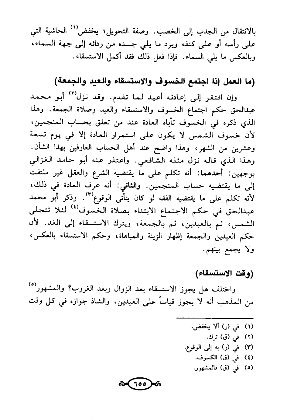 وإن افتقر إلى إعادته أعيد لما تقدم. وقد نزل (¬2) أبو محمد عبد الحق حكم اجتماع الخسوف والاستسقاء والعيد وصلاة الجمعة. وهذا الذي ذكره في الخسوف تأباه العادة عند من تعلق بحساب المنجمين، لأن خسوف الشمس لا يكون على استمرار العادة إلا في يوم تسعة وعشرين من الشهر، وهذا واضح عند أهل الحساب العارفين بهذا الشأن وهذا الذي قاله نزل مثله الشافعي، واعتذر عنه أبو حامد الغزالي بوجهين: أحدهما: أنه تكلم على ما يقتضيه الشرع والعقل غير ملتفت إلى ما يقتضيه حساب المنجمين. والثاني: أنه عرف العادة في ذلك، لأنه تكلم على ما يقتضيه الفقه لو كان يتأتى الوقوع (¬3). وذكر أبو محمد عبد الحق في حكم الاجتماع الابتداء بصلاة الخسوف (¬4) لئلا تتجلى الشمس، ثم بالعيدين، ثم بالجمعة، ويترك الاستسقاء إلى الغد. لأن حكم العيدين والجمعة إظهار الزينة والمباهاة، وحكم الاستسقاء بالعكس، ولا يجمع بينهم.