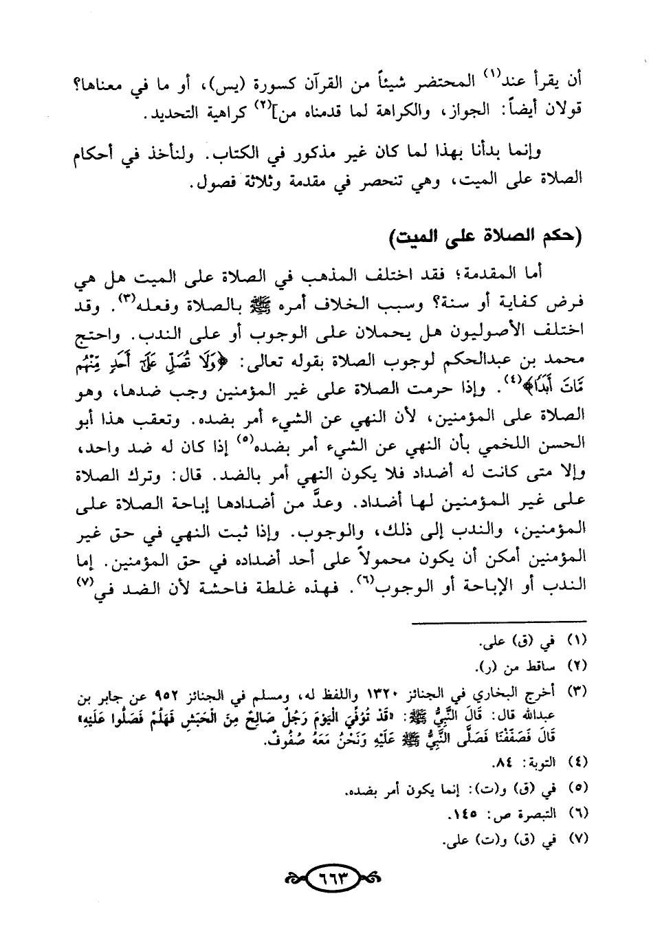 أما المقدمة؛ فقد اختلف المذهب في الصلاة على الميت هل هي فرض كفاية أو سنة؟ وسبب الخلاف أمره -صلى الله عليه وسلم - بالصلاة وفعله (¬3). وقد اختلف الأصوليون هل يحملان على الوجوب أو على الندب. واحتج محمد بن عبد الحكم لوجوب الصلاة بقوله تعالى: {وَلَا تُصَلِّ عَلَى أَحَدٍ مِنْهُمْ مَاتَ أَبَدًا} (¬4). وإذا حرمت الصلاة على غير المؤمنين وجب ضدها، وهو الصلاة على المؤمنين, لأن النهي عن الشيء أمر بضده. وتعقب هذا أبو الحسن اللخمي بأن النهي عن الشيء أمر بضده (¬5) إذا كان له ضد واحد، وإلا متى كانت له أضداد فلا يكون النهي أمر بالضد. قال: وترك الصلاة على غير المؤمنين لها أضداد. وعدَّ من أضدادها إباحة الصلاة على المؤمنين، والندب إلى ذلك، والوجوب. وإذا ثبت النهي في حق غير المؤمنين أمكن أن يكون محمولاً على أحد أضداده في حق المؤمنين. إما الندب أو الإباحة أو الوجوب (¬6). فهذه غلطة فاحشة لأن الضد في (¬7)