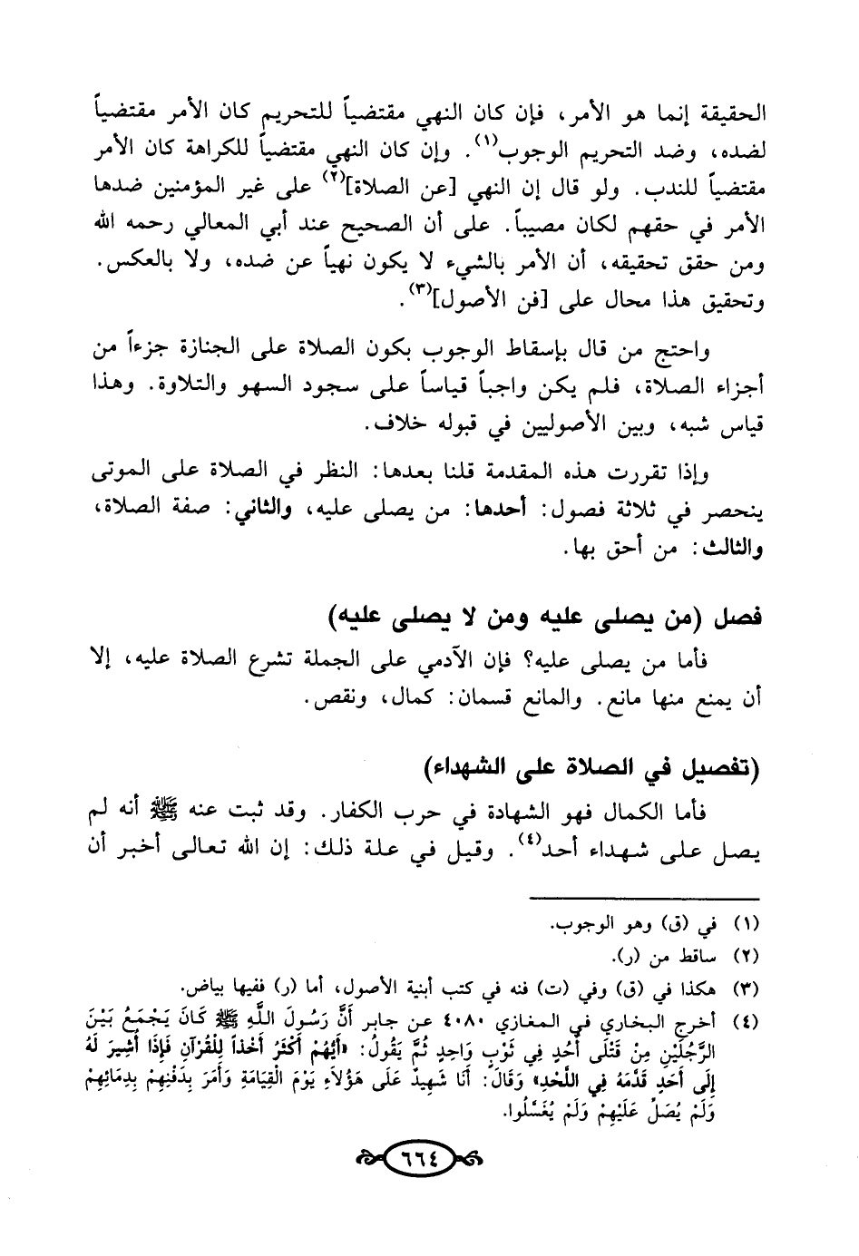 (¬4) أخرج البخاري في المغازي 4080 عن جابر أَنَّ رَسُولَ اللهِ - صلى الله عليه وسلم -كَانَ يَجْمَعُ بَيْنَ الرَّجُليْنِ من قَتْلَى أحُدِ في ثوْبٍ وَاحِدٍ ثُمَّ يَقُولُ: أَيهُمْ أكْثَرُ أَخذاً للِقُرآَنِ فإذا أشِيرَ لَهُ إِلَى أَحدٍ قَدَّمَهُ في اللَّحْدِ" وَقَال: أنا شَهِيدٌ عَلَى هَؤُلاَءِ يَومَ الْقِيَامَةِ وَأَمَرَ بِدَفنهم بِدِمَائِهم ولم يُصَلْ عَلَيْهِمْ وَلَمْ يُغَسَّلُوا.