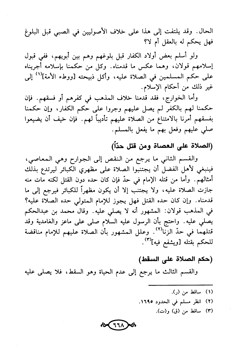 والقسم الثاني ما يرجع من النقص إلى الجوارح وهي المعاصي، فينبغي لأهل الفضل أن يجتنبوا الصلاة على مظهري الكبائر ليرتدع بذلك أمثالهم. وأما من قتله الإمام في حدّ فإن كان حده دون القتل لكنه مات منه جازت الصلاة عليه، ولا يجتنب إلا أن يكون مظهراً للكبائر فيرجع إلى ما قدمناه. وإن كان حده القتل فهل يجوز للإمام المتولي حده الصلاة عليه؟ في المذهب قولان: المشهور أنه لا يصلي عليه. وقال محمد بن عبد الحكم يصلي عليه. واحتج بأن الرسول عليه السلام صلى على ماعز والغامدية وقد قتلهما في حد الزنا (¬2). وعلل المشهور بأن الصلاة عليهم للإمام مناقضة للحكم بقتله [ويشفع فيه] (¬3).