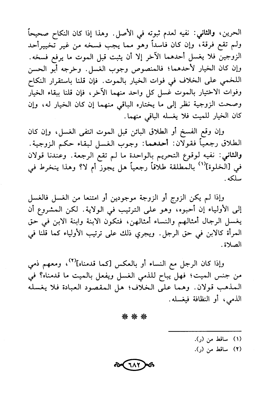 الحرمين، والثاني: نفيه لعدم ثبوته في الأصل. وهذا إذا كان النكاح صحيحاً ولم تقع فرقة، وإن كان فاسداً وهو مما يجب فسخه من غير تخيير أحد الزوجين فلا يغسل أحدهما الآخر إلا أن يثبت قبل الموت ما يرفع فسخه. وإن كان الخيار لأحدهما؛ فالمنصوص وجوب الغسل. وخرجه أبو الحسن اللخمي على الخلاف في فوات الخيار بالموت. فإن قلنا باستقرار النكاح وفوات الاختيار بالموت غسل كل واحد منهما الآخر، فإن قلنا ببقاء الخيار وصحت الزوجية نظر إلى ما يختاره الباقي منهما إن كان الخيار له، وإن كان الخيار للميت فلا يغسله الباقي منهما.