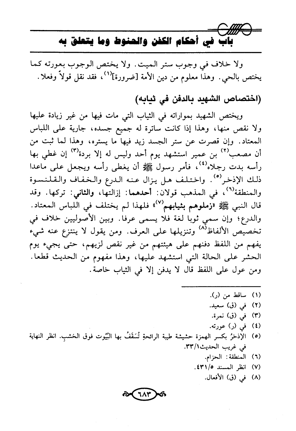 ويختص الشهيد بمواراته في الثياب التي مات فيها من غير زيادة عليها ولا نقص منها، وهذا إذا كانت ساترة له جميع جسده، جارية على اللباس المعتاد. وإن قصرت عن ستر الجسد زيد فيها ما يستره، وهذا لما ثبت من أن مصعب (¬2) بن عمير استشهد يوم أحد وليس له إلا بردة (¬3) إن غطي بها رأسه بدت رجلاه (¬4)، فأمر رسول-صلى الله عليه وسلم- أن يغطى رأسه ويجعل على ماعدا ذلك الإذخر (¬5).واختلف هل يزال عنه الدرع والخفاف والقلنسوة والمنطقة (¬6)، في المذهب قولان: أحدهما: إزالتها، والثاني: تركها. وقد قال النبي-صلى الله عليه وسلم -"زملوهم بثيابهم (¬7) " فلهذا لم يختلف في اللباس المعتاد. والدرع؛ وإن سمي ثوبا لغة فلا يسمى عرفا. وبين الأصوليين خلاف في تخصيص الألفاظ (¬8) وتنزيلها على العرف. ومن يقول لا ينتزع عنه شيء يفهم من اللفظ دفنهم على هيئتهم من غير نقص لزيهم، حتى يجيء يوم الحشر على الحالة التي استشهد عليها، وهذا مفهوم من الحديث قطعا. ومن عول على اللفظ قال لا يدفن إلا في الثياب خاصة.