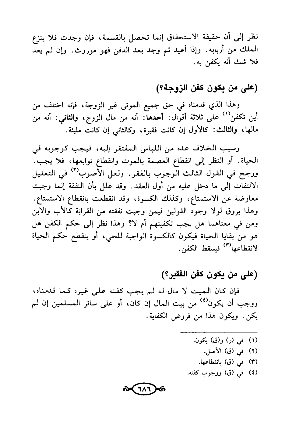 وسبب الخلاف عده من اللباس المفتقر إليه، فيجب كوجوبه في الحياة. أو النظر إلى انقطاع العصمة بالموت وانقطاع توابعها، فلا يجب. ورجح في القول الثالث الوجوب بالفقر. ولعل الأصوب (¬2) في التعليل الالتفات إلى ما دخل عليه من أول العقد. وقد علل بأن النفقة إنما وجبت معاوضة عن الاستمتاع، وكذلك الكسوة، وقد انقطعت بانقطاع الاستمتاع. وهذا يروق لولا وجود القولين فيمن وجبت نفقته من القرابة كالأب والابن ومن في معناهما هل يجب تكفينهم أم لا؟ وهذا نظر إلى حكم الكفن هل هو من بقايا الحياة فيكون كالكسوة الواجبة للحي، أو ينقطع حكم الحياة لانقطاعها (¬3) فيسقط الكفن.