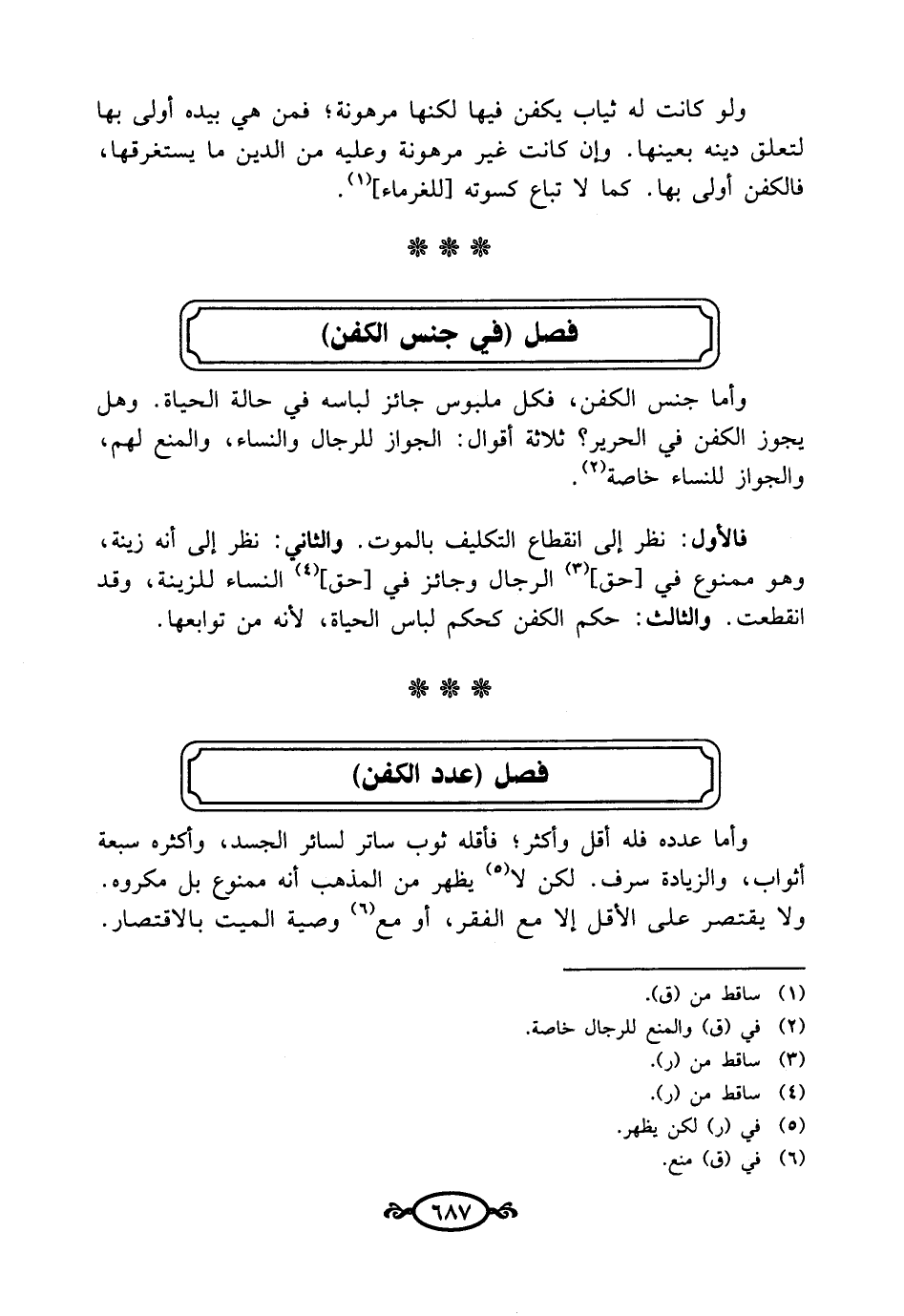 وأما عدده فله أقل وأكثر؛ فأقله ثوب ساتر لسائر الجسد، وأكثره سبعة أثواب، والزيادة سرف. لكن لا (¬5) يظهر من المذهب أنه ممنوع بل مكروه. ولا يقتصر على الأقل إلا مع الفقر، أو مع (¬6) وصية الميت بالاقتصار.