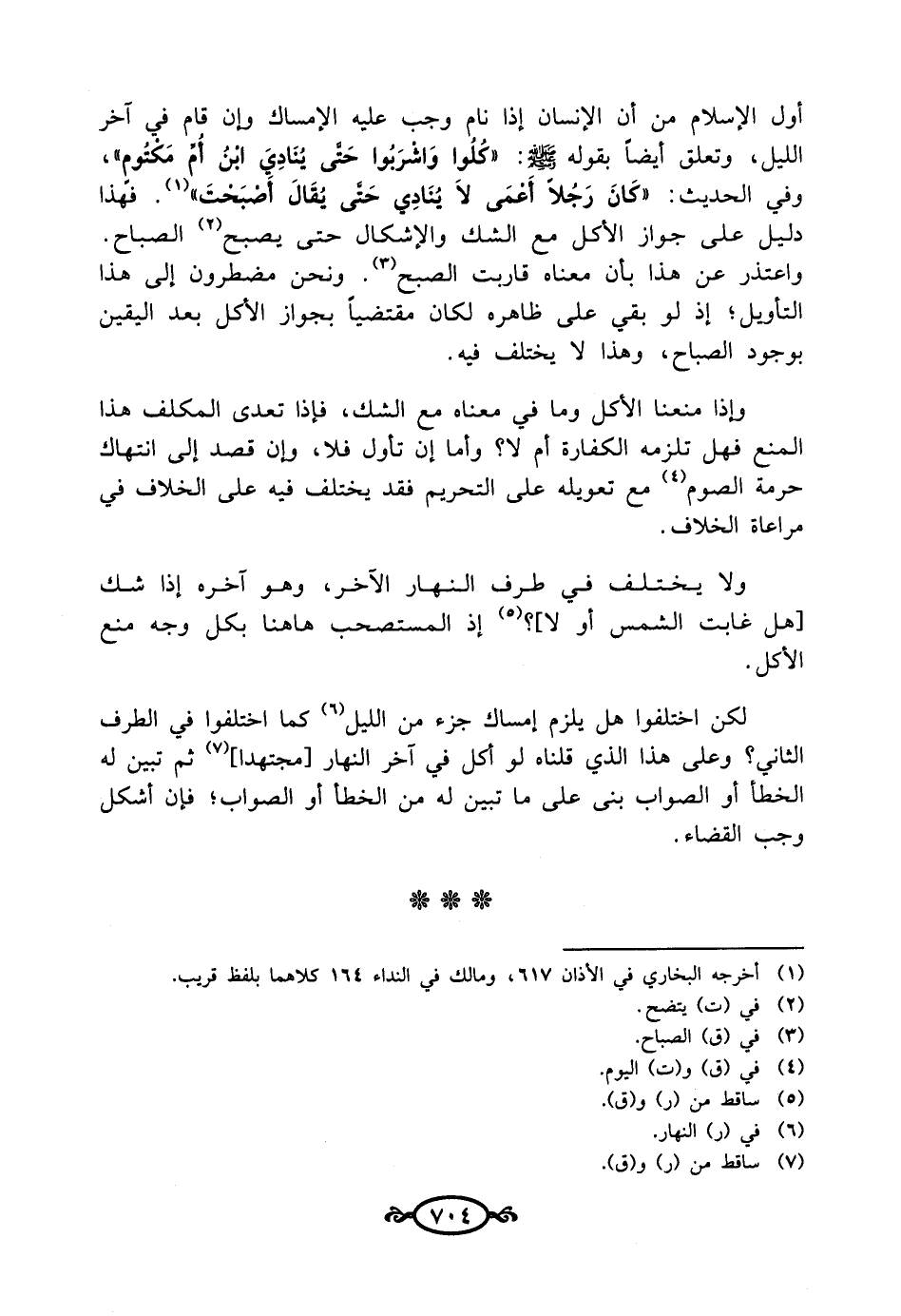 أول الإسلام من أن الإنسان إذا نام وجب عليه الإمساك وإن قام في آخر الليل، وتعلق أيضًا بقوله-صلى الله عليه وسلم -"كُلُوا وَاشْرَبُوا حَتَّى يُنَادِيَ ابْنُ أُم مَكْتُوم", وفي الحديث:"كَانَ رَجُلاً أَعْمَى لاَ يُنادى حَتَّى يُقَالَ أَصْبَحْتَ" (¬1). فهذا دليل على جواز الأكل مع الشك والإشكال حتى يصبح (¬2) الصباح. واعتذر عن هذا بأن معناه قاربت الصبح (¬3). ونحن مضطرون إلى هذا التأويل؛ إذ لو بقي على ظاهره لكان مقتضياً بجواز الأكل بعد اليقين بوجود الصباح، وهذا لا يختلف فيه.