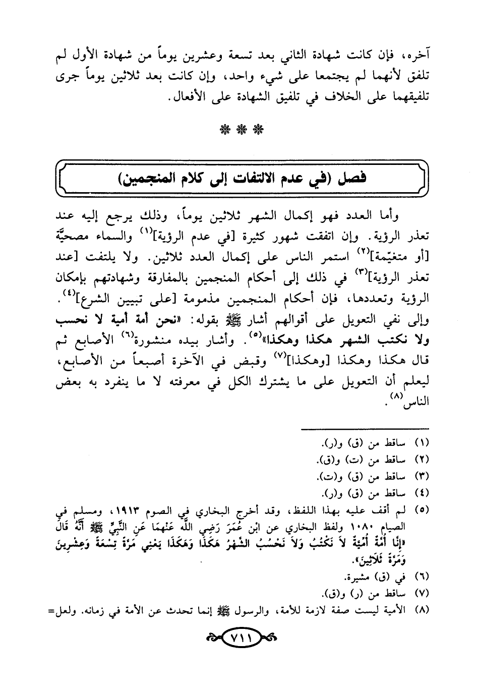 وأما العدد فهو إكمال الشهر ثلاثين يومًا، وذلك يرجع إليه عند تعذر الرؤية. وإن اتفقت شهور كثيرة [في عدم الرؤية] (¬1) والسماء مصحيَّة [أو متغيّمة] (¬2) استمر الناس على إكمال العدد ثلاثين. ولا يلتفت [عند تعذر الرؤية] (¬3) في ذلك إلى أحكام المنجمين بالمفارقة وشهادتهم بإمكان الرؤية وتعددها، فإن أحكام المنجمين مذمومة [على تبيين الشرع] (¬4). وإلى نفي التعويل على أقوالهم أشار- صلى الله عليه وسلم -بقوله: "نحن أمة أمية لا نحسب ولا نكتب الشهر هكذا وهكذا" (¬5). وأشار بيده منشورة (¬6) الأصابع ثم قال هكذا وهكذا [وهكذا] (¬7) وقبض في الآخرة أصبعاً من الأصابع، ليعلم أن التعويل على ما يشترك الكل في معرفته لا ما ينفرد به بعض الناس (¬8).