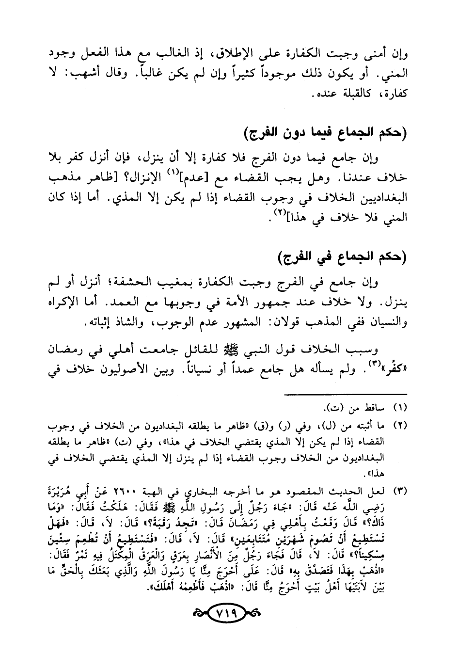 (¬3) لعل الحديث المقصود هو ما أخرجه البخاري في الهبة 2600 عَنْ أَبِي هُرَيرَةَ رَضِي الله عَنْه قَالَ: "جَاءَ رَجُل إِلَى رَسُولِ اللُهِ - صلى الله عليه وسلم - فَقَالَ: هَلَكْتُ فَقَالَ: "ومَا ذَاكَ؟ " قَالَ وَقَعْتُ بأهلِي في رَمَضَانَ قَالَ: "تَجدُ رقَبَة؟ " قَالَ: لاَ، قَالَ: "فَهَل تَستَطِيعُ أن تَصُومَ شَهرَينِ مُتَتَابعَين" قَالَ: لاَ، قَالَ: "فَتستَطِيعُ أن تُطعِمَ ستينَ مِسكِيناً؟ " قَالَ: لاَ، قَالَ فَجَاءَ رَجُلْ مِنَ الأَنصَارِ بِعَرق وَالْعَرَقُ المِكتَلُ فِيهِ تَمرٌ فَقَالَ: "اذهب بهذا فَتصدق بِه" قَالَ: عَلَى أَحوَجَ منا يا رَسُولَ الله وَالَذِي بَعَثَكَ بِالحَق مَا بَينَ لاَبَتَيها أَهلُ بَيت أَحوَجُ منَّا قَالَ: "اذهَب فَأَطعمهُ أَهلَك".