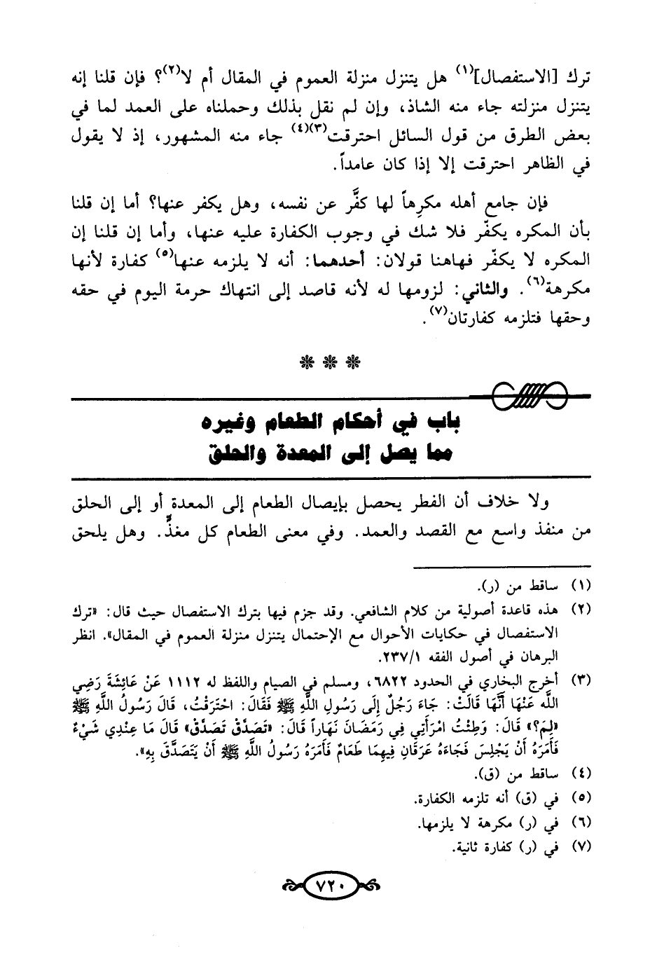 ترك [الاستفصال] (¬1) هل يتنزل منزلة العموم في المقال أم لا (¬2)؟ فإن قلنا إنه يتنزل منزلته جاء منه الشاذ، وإن لم نقل بذلك وحملناه على العمد لما في بعض الطرق من قول السائل احترقت (¬3) (¬4) جاء منه المشهور، إذ لا يقول في الظاهر احترقت إلا إذا كان عامداً.