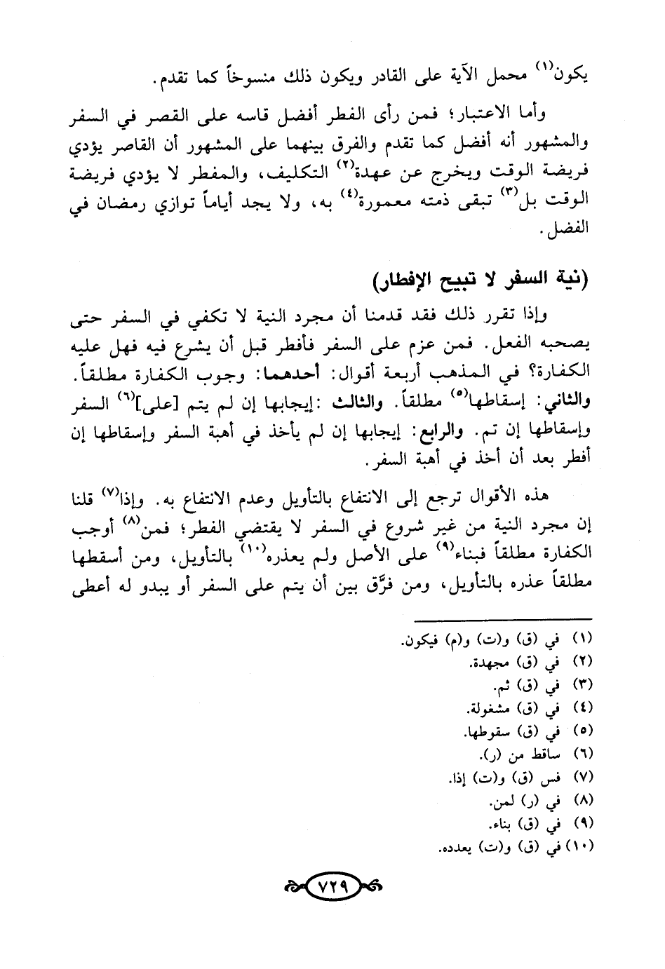 وأما الاعتبار؛ فمن رأى الفطر أفضل قاسه على القصر في السفر والمشهور أنه أفضل كما تقدم والفرق بينهما على المشهور أن القاصر يؤدي فريضة الوقت ويخرج عن عهدة (¬2) التكليف، والمفطر لا يؤدي فريضة الوقت بل (¬3) تبقى ذمته معمورة (¬4) به، ولا يجد أيامًا توازي رمضان في الفضل. (نية السفر لا تبيح الإفطار)