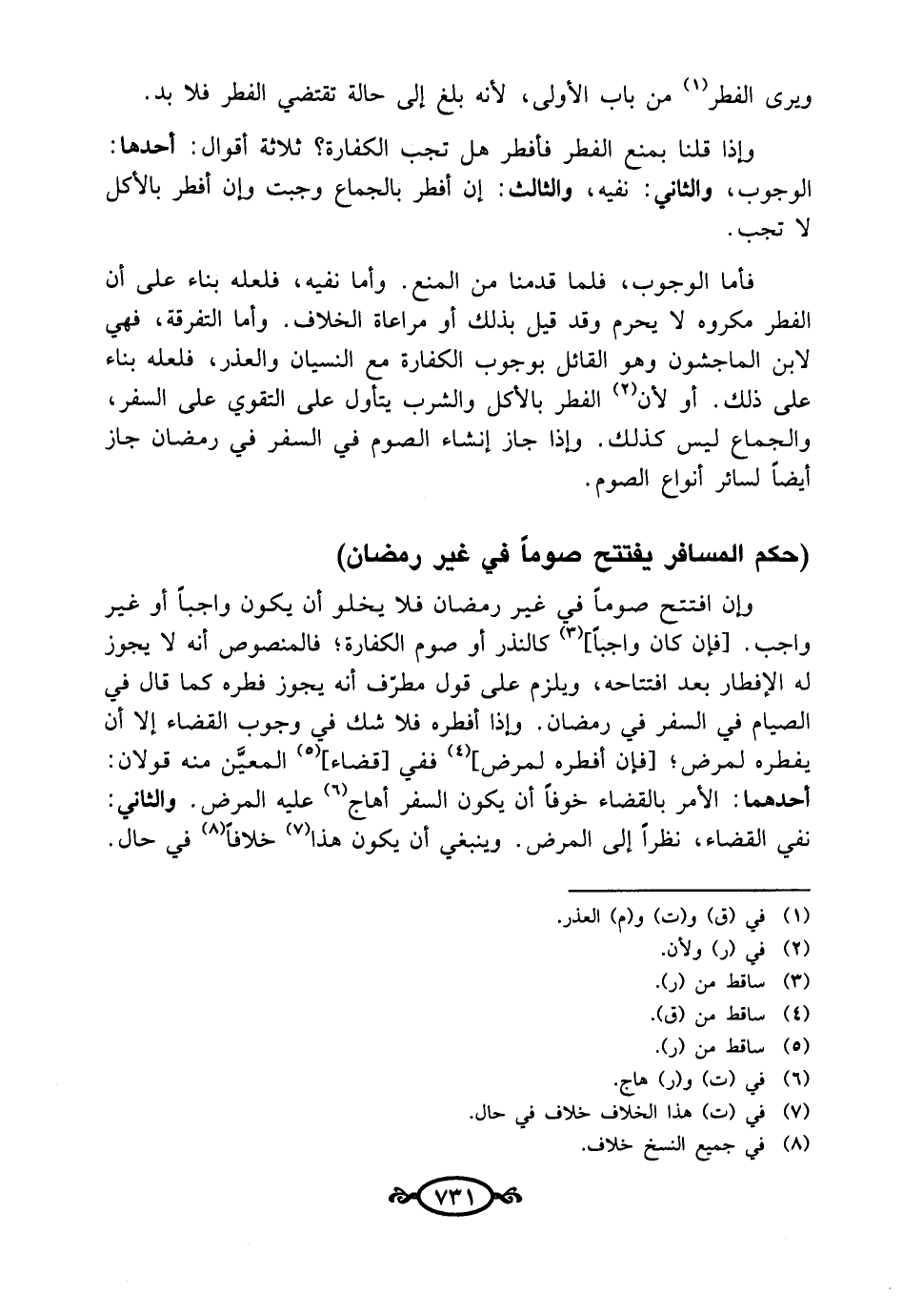 وإن افتتح صوماً في غير رمضان فلا يخلو أن يكون واجبًا أو غير واجب. [فإن كان واجباً] (¬3) كالنذر أو صوم الكفارة؛ فالمنصوص أنه لا يجوز له الإفطار بعد افتتاحه، ويلزم على قول مطرف أنه يجوز فطره كما قال في الصيام في السفر في رمضان. وإذا أفطره فلا شك في وجوب القضاء إلا أن يفطره لمرض؛ [فإن أفطره لمرض] (¬4) ففي [قضاء] (¬5) المعيَّن منه قولان: أحدهما: الأمر بالقضاء خوفاً أن يكون السفر أهاج (¬6) عليه المرض. والثاني: نفي القضاء، نظرًا إلى المرض. وينبغي أن يكون هذا (¬7) خلافًا (¬8) في حال.