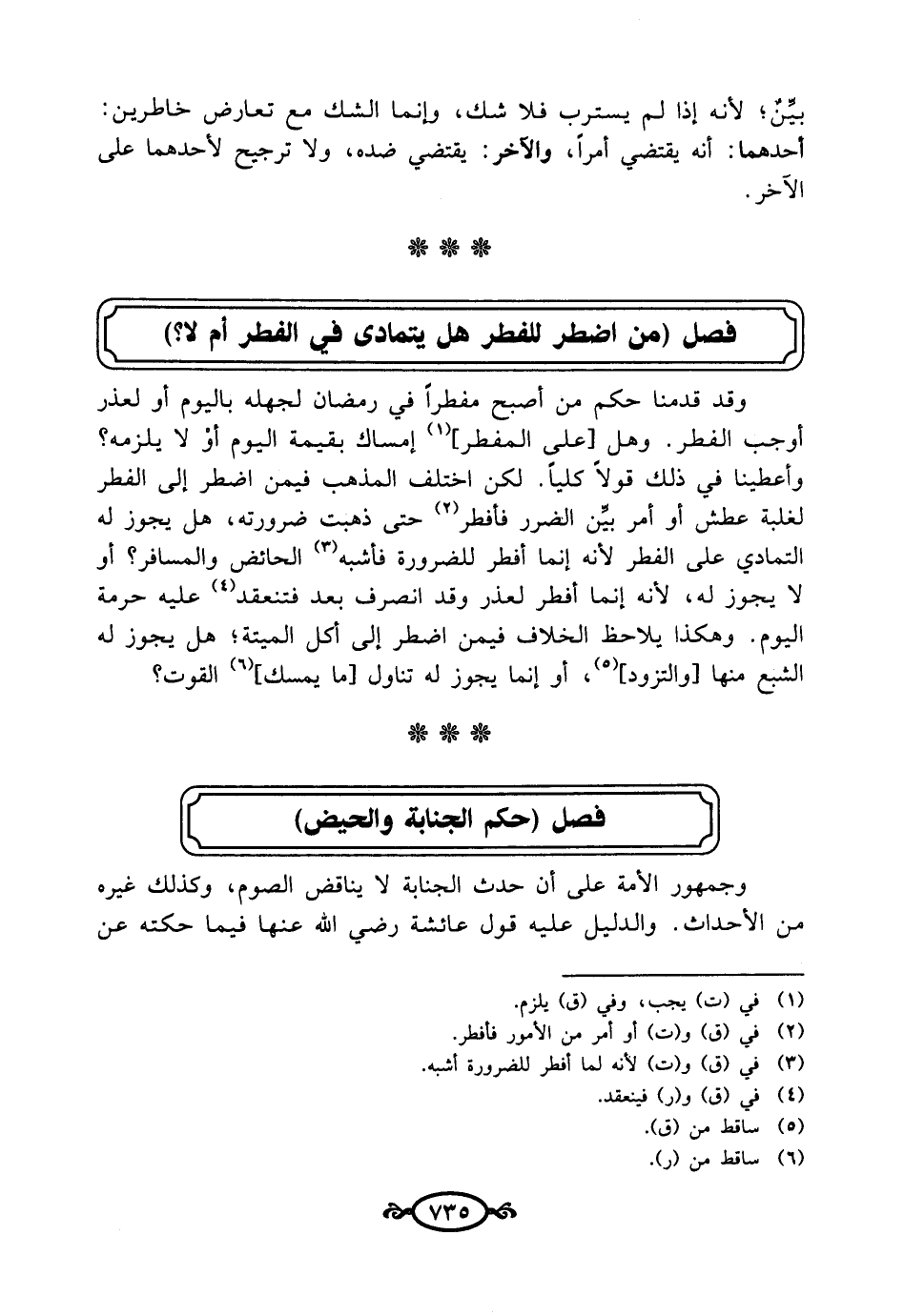 وقد قدمنا حكم من أصبح مفطراً في رمضان لجهله باليوم أو لعذر أوجب الفطر. وهل [على المفطر] (¬1) إمساك بقيمة اليوم أوْ لا يلزمه؟ وأعطينا في ذلك قولًا كليًا. لكن اختلف المذهب فيمن اضطر إلى الفطر لغلبة عطش أو أمر بيِّن الضرر فأفطر (¬2) حتى ذهبت ضرورته، هل يجوز له التمادي على الفطر لأنه إنما أفطر للضرورة فأشبه (¬3) الحائض والمسافر؟ أو لا يجوز له، لأنه إنما أفطر لعذر وقد انصرف بعد فتنعقد (¬4) عليه حرمة اليوم. وهكذا يلاحظ الخلاف فيمن اضطر إلى أكل الميتة؛ هل يجوز له الشبع منها [والتزود] (¬5)، أو إنما يجوز له تناول [ما يمسك] (¬6) القوت؟