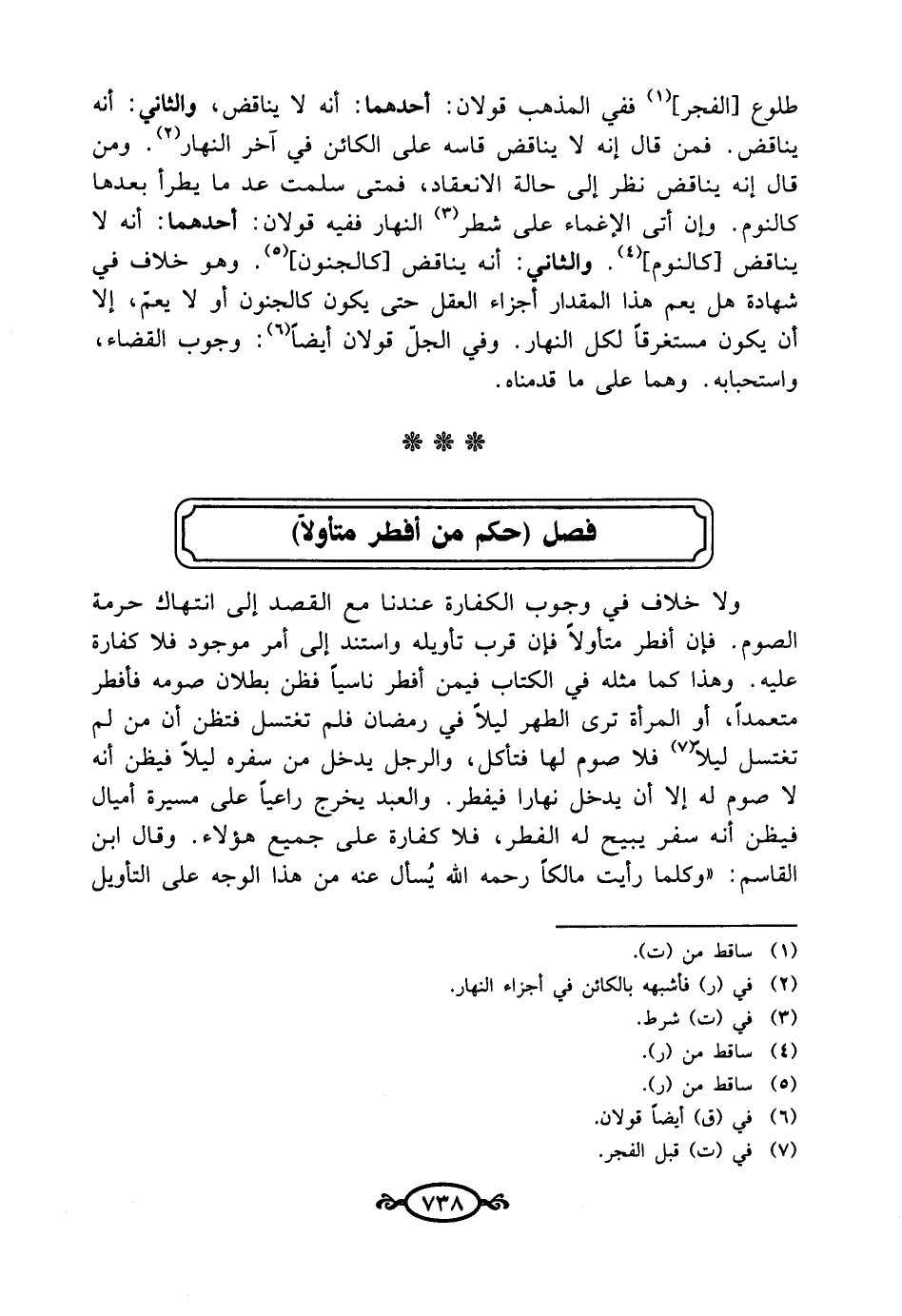 طلوع [الفجر] (¬1) ففي المذهب قولان: أحدهما: أنه لا يناقض، والثاني: أنه يناقض. فمن قال إنه لا يناقض قاسه على الكائن في آخر النهار (¬2). ومن قال إنه يناقض نظر إلى حالة الانعقاد، فمتى سلمت عد ما يطرأ بعدها كالنوم. وإن أتى الإغماء على شطر (¬3) النهار ففيه قولان: أحدهما: أنه لا يناقض [كالنوم] (¬4). والثاني: أنه يناقض [كالجنون] (¬5). وهو خلاف في شهادة هل يعم هذا المقدار أجزاء العقل حتى يكون كالجنون أو لا يعمّ، إلا أن يكون مستغرقاً لكل النهار. وفي الجل قولان أيضًا (¬6): وجوب القضاء، واستحبابه. وهما على ما قدمناه.