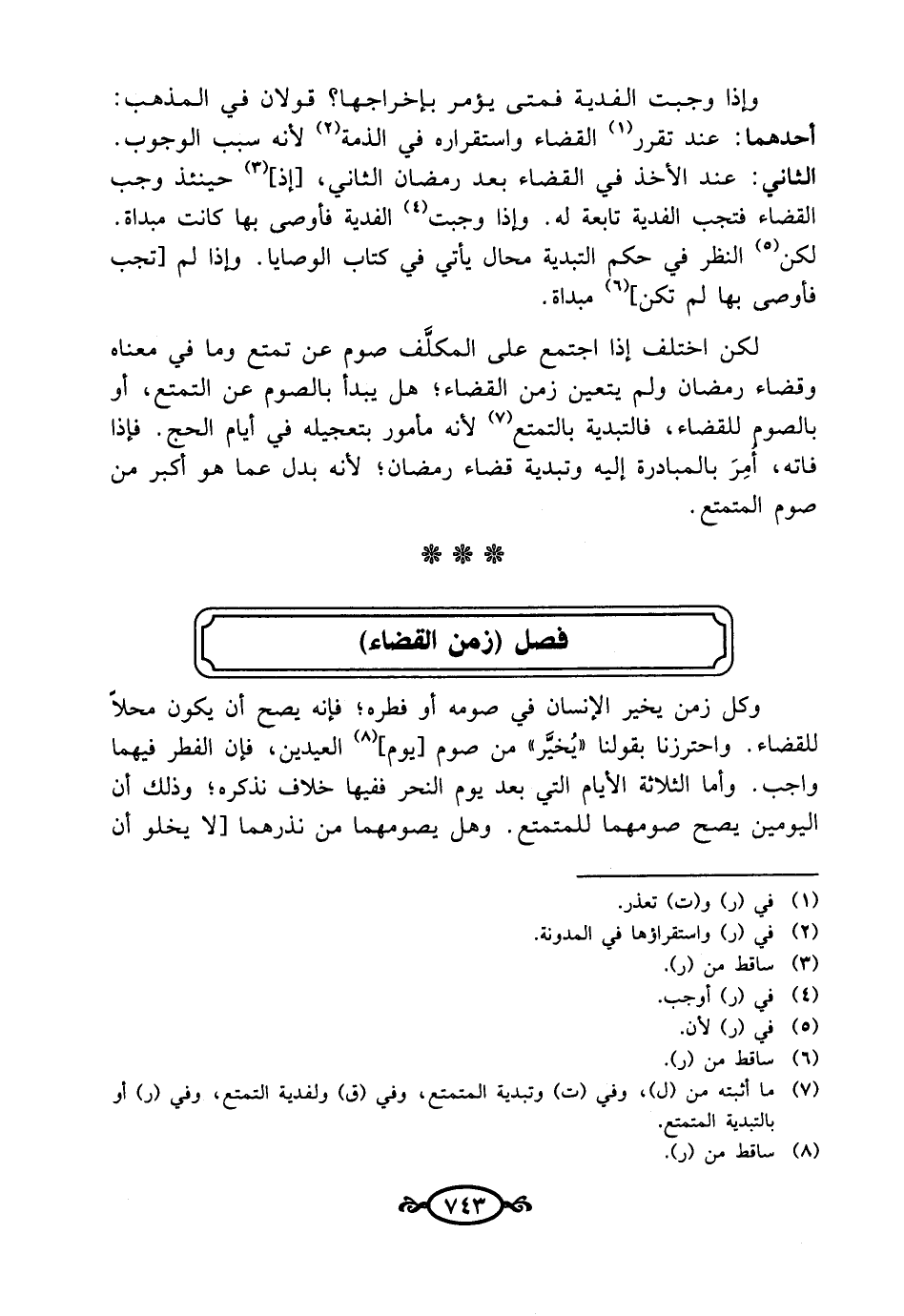 وكل زمن يخير الإنسان في صومه أو فطره؛ فإنه يصح أن يكون محلاً للقضاء. واحترزنا بقولنا "يُخيَّر" من صوم [يوم] (¬8) العيدين، فإن الفطر فيهما واجب. وأما الثلاثة الأيام التي بعد يوم النحر ففيها خلاف نذكره؛ وذلك أن اليومين يصح صومهما للمتمتع. وهل يصومهما من نذرهما [لا يخلو أن