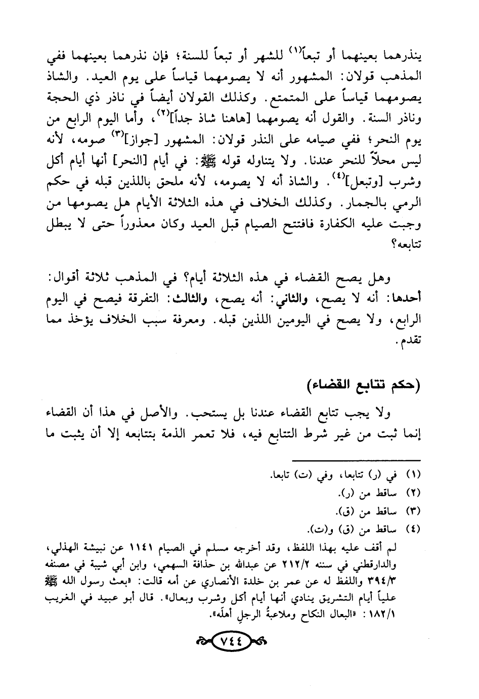 ينذرهما بعينهما أو تبعاً (¬1) للشهر أو تبعاً للسنة؛ فإن نذرهما بعينهما ففي المذهب قولان: المشهور أنه لا يصومهما قياسًا على يوم العيد. والشاذ يصومهما قياسًا على المتمتع. وكذلك القولان أيضًا في ناذر ذي الحجة وناذر السنة. والقول أنه يصومهما [هاهنا شاذ جدًا] (¬2)، وأما اليوم الرابع من يوم النحر؛ ففي صيامه على النذر قولان: المشهور [جواز] (¬3) صومه، لأنه ليس محلاً للنحر عندنا. ولا يتناوله قوله - صلى الله عليه وسلم -: في أيام [النحر] أنها أيام أكل وشرب [وتبعل] (¬4). والشاذ أنه لا يصومه، لأنه ملحق باللذين قبله في حكم الرمي بالجمار. وكذلك الخلاف في هذه الثلاثة الأيام هل يصومها من وجبت عليه الكفارة فافتتح الصيام قبل العيد وكان معذوراً حتى لا يبطل تتابعه؟