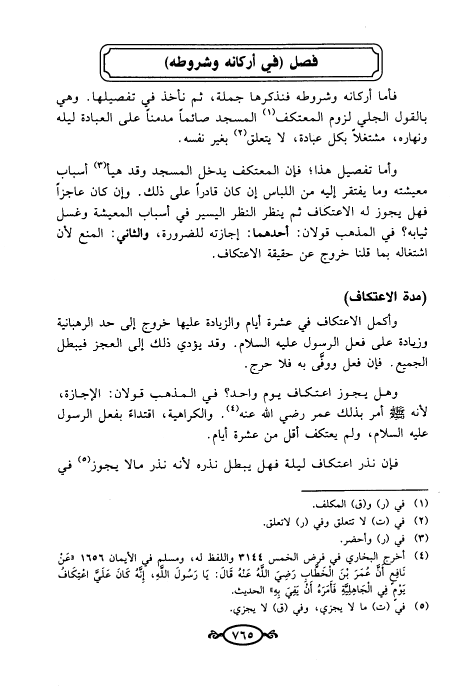 فأما أركانه وشروطه فنذكرها جملة، ثم نأخذ في تفصيلها. وهي بالقول الجلي لزوم المعتكف (¬1) المسجد صائمًا مدمناً على العبادة ليله ونهاره، مشتغلاً بكل عبادة، لا يتعلق (¬2) بغير نفسه.