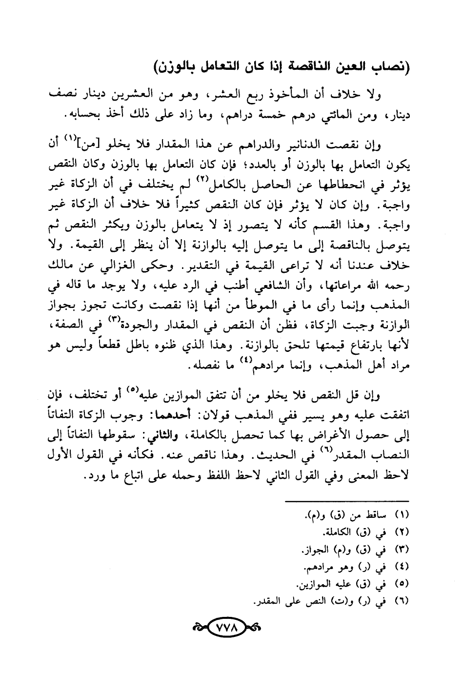 وإن قل النقص فلا يخلو من أن تتفق الموازين عليه (¬5) أو تختلف، فإن اتفقت عليه وهو يسير ففي المذهب قولان: أحدهما: وجوب الزكاة التفاتاً إلى حصول الأغراض بها كما تحصل بالكاملة، والثانى: سقوطها التفاتًا إلى النصاب المقدر (¬6) في الحديث. وهذا ناقص عنه. فكأنه في القول الأول لاحظ المعنى وفي القول الثاني لاحظ اللفظ وحمله على اتباع ما ورد.