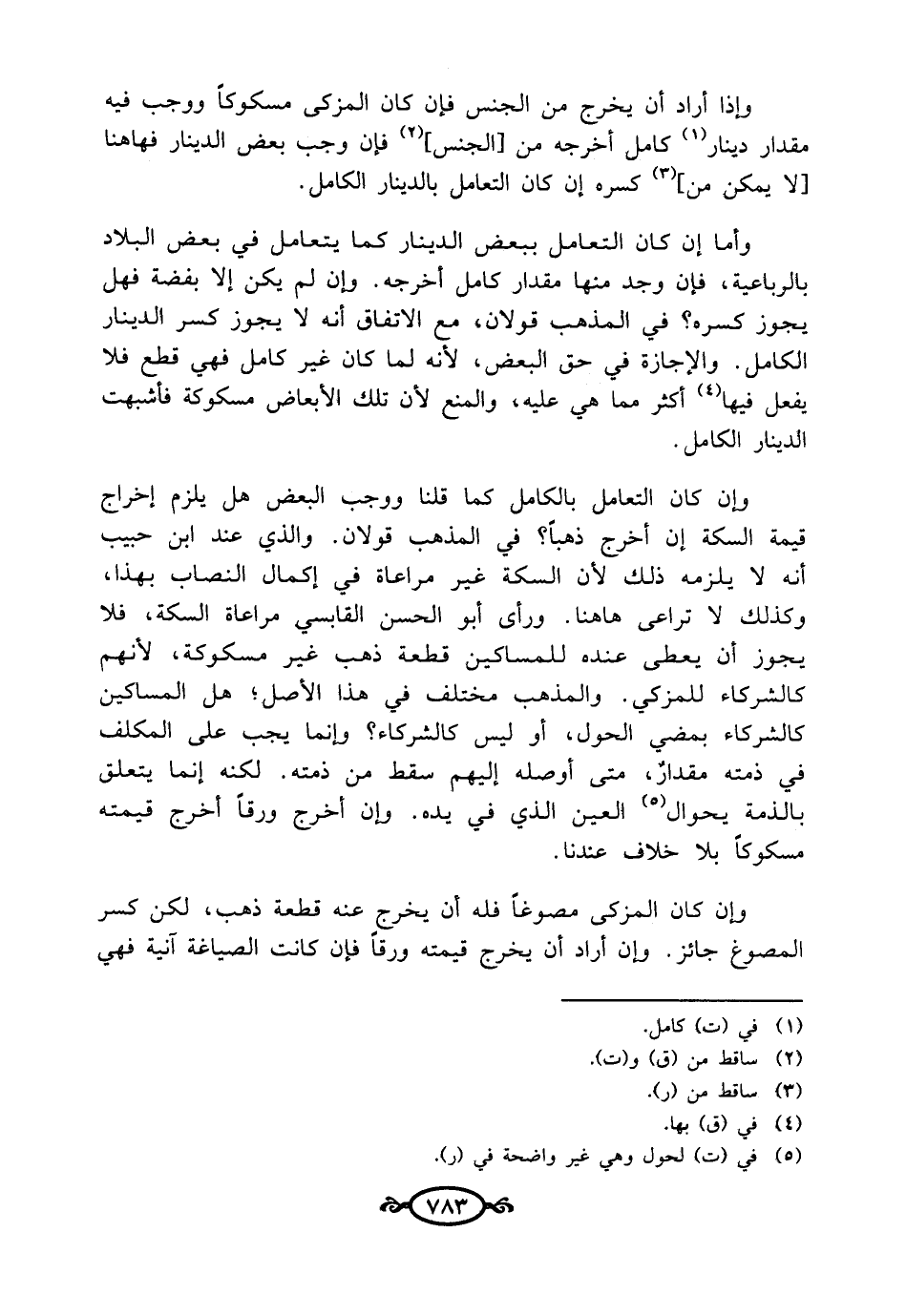 وإن كان التعامل بالكامل كما قلنا ووجب البعض هل يلزم إخراج قيمة السكة إن أخرج ذهباً؟ في المذهب قولان. والذي عند ابن حبيب أنه لا يلزمه ذلك لأنّ السكة غير مراعاة في إكمال النصاب بهذا، وكذلك لا تراعى هاهنا. ورأى أبو الحسن القابسي مراعاة السكة، فلا يجوز أن يعطى عنده للمساكين قطعة ذهب غير مسكوكة؛ لأنهم كالشركاء للمزكي. والمذهب مختلف في هذا الأصل؛ هل المساكين كالشركاء بمضي الحول، أو ليس كالشركاء؛ وإنما يجب على المكلف في ذمته مقدارٌ، متى أوصله إليهم سقط من ذمته. لكنه إنما يتعلق بالذمة يحوال (¬5) العين الذي في يده. وإن أخرج ورقاً أخرج قيمته مسكوكاً بلا خلاف عندنا.