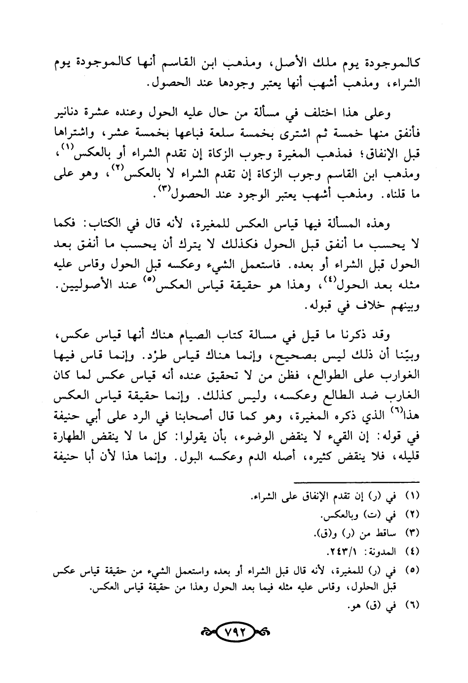 (¬5) في (ر) للمغيرة؛ لأنه قال قبل الشراء أو بعده واستعمل الشيء من حققة قياس عكس قبل الحلول، وقاس عليه مثله فيما بعد الحول وهذا من حقيقة قياس العكس.