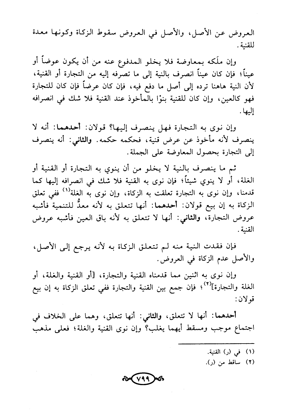 ثم ما ينصرف بالنية لا يخلو من أن ينوي به التجارة أو القنية أو الغلة، أو لا ينوي شيئًا؛ فإن نوى به القنية فلا شك في انصرافه إليها كما قدمنا، وإن نوى به التجارة تعلقت به الزكاة، وإن نوى به الغلة (¬1) ففي تعلق الزكاة به إن بيع قولان: أحدهما: أنها تتعلّق به لأنه معدُّ للتنمية فأشبه عروض التجارة، والثاني: أنها لا تتعلّق به لأنه باق العين فأشبه عروض القنية.