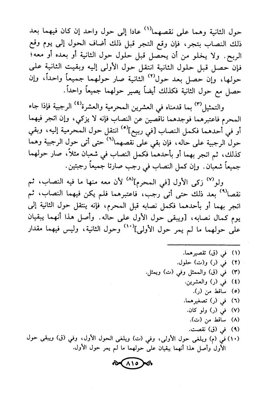 والتمثيل (¬3) بما قدمناه في العشرين المحرمية والعشرة (¬4) الرجبية فإذا جاء المحرم فاعتبرهما فوجدهما ناقصين عن النصاب فإنه لا يزكي، وإن اتجر فيهما أو في أحدهما فكمل النصاب [في ربيع] (¬5) انتقل حول المحرمية إليه، وبقي حول الرجبية على حاله، فإن بقي على نقصهما (¬6) حتى أتى حول الرجبية وهما كذلك، ثم اتجر بهما أو بأحدهما فكمل النصاب في شعبان مثلًا، صار حولهما جميعاً شعبان. وإن كمل النصاب في رجب صارتا جميعاً رجبتين.